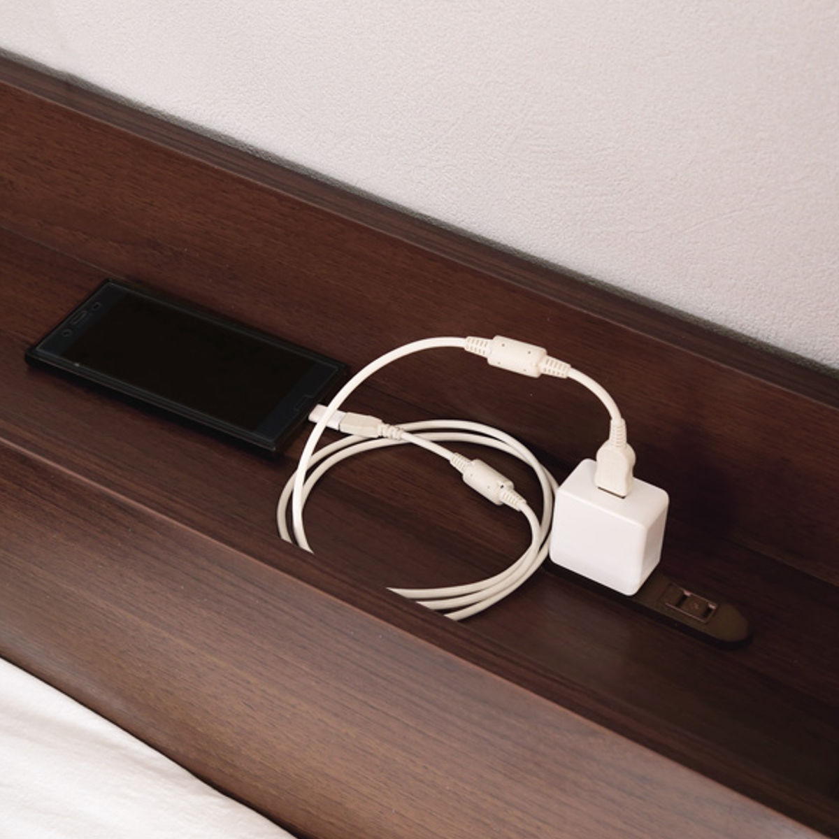2口コンセントがついた宮棚は奥行が13.8cm。時計やメガネを置いたり、スマートフォンの充電や間接照明の使用など、就寝時やくつろぎ時間を快適にサポートします。