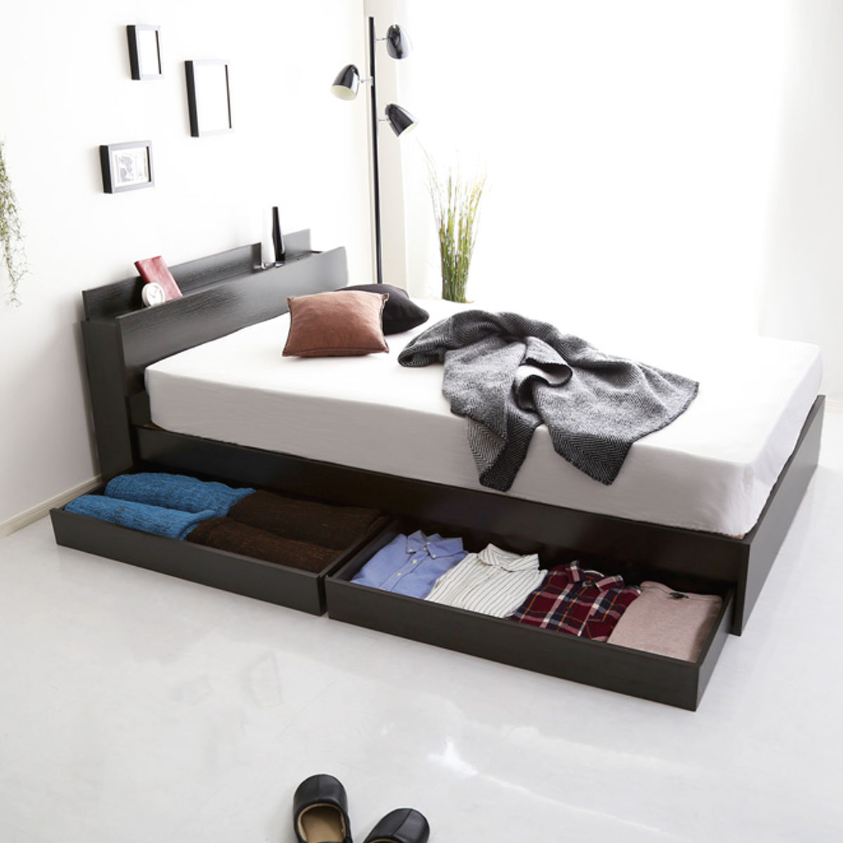 衣類や寝具をたっぷり収納できる引出しはベッド下の両サイドどちらにも取り付けることができます。引出しの代わりに収納ケースなどを使えば色々な物をベッド下に片付けることができます。