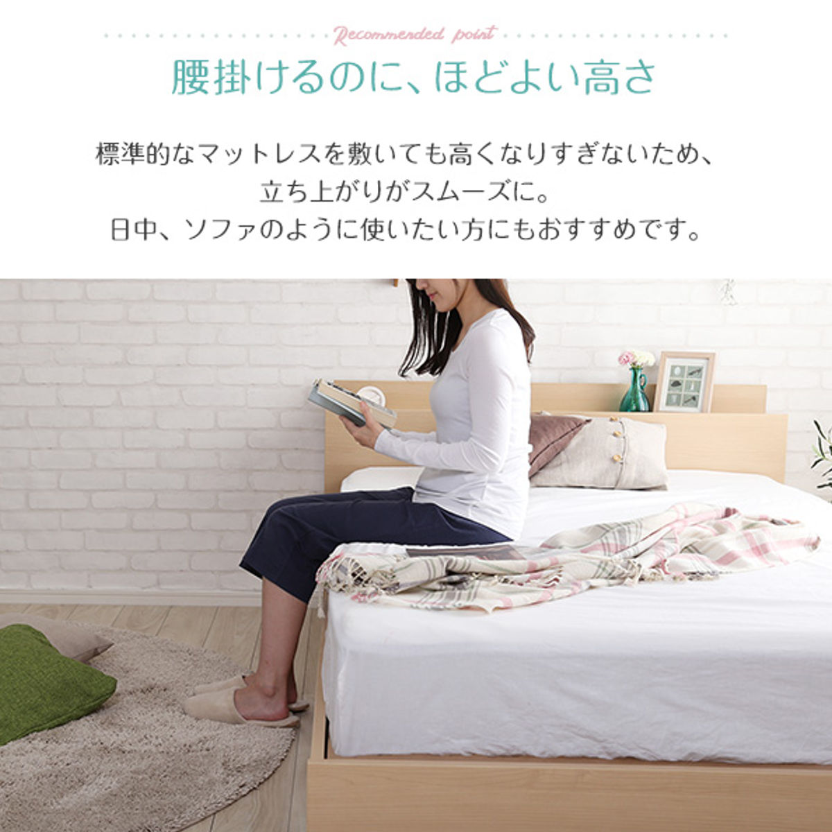 標準的なマットレスを置いても高くなりすぎないため、立ち上がりもスムーズに。日中はソファのようにも使えます。