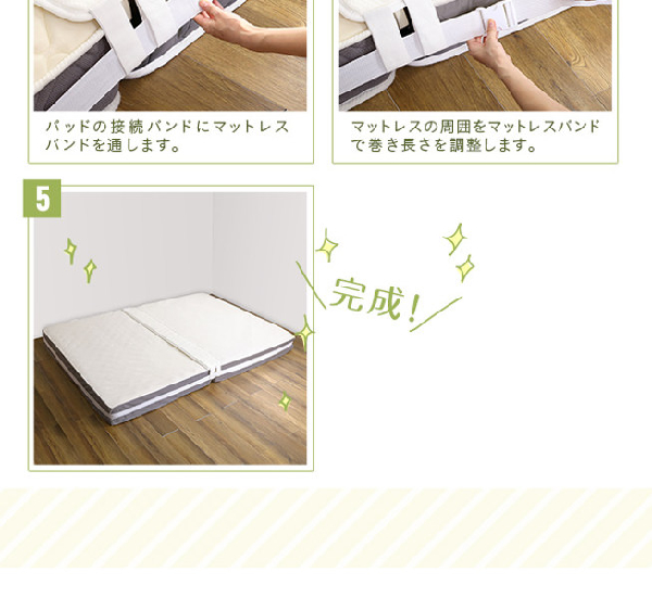 | 材質 | パッド表面:布(ポリエステル100%) パッド裏面:ウレタン 接続ベルト:布(ポリエステル100%) マットレスバンド:布(ポリエステル100%) バックル:プラスチック |