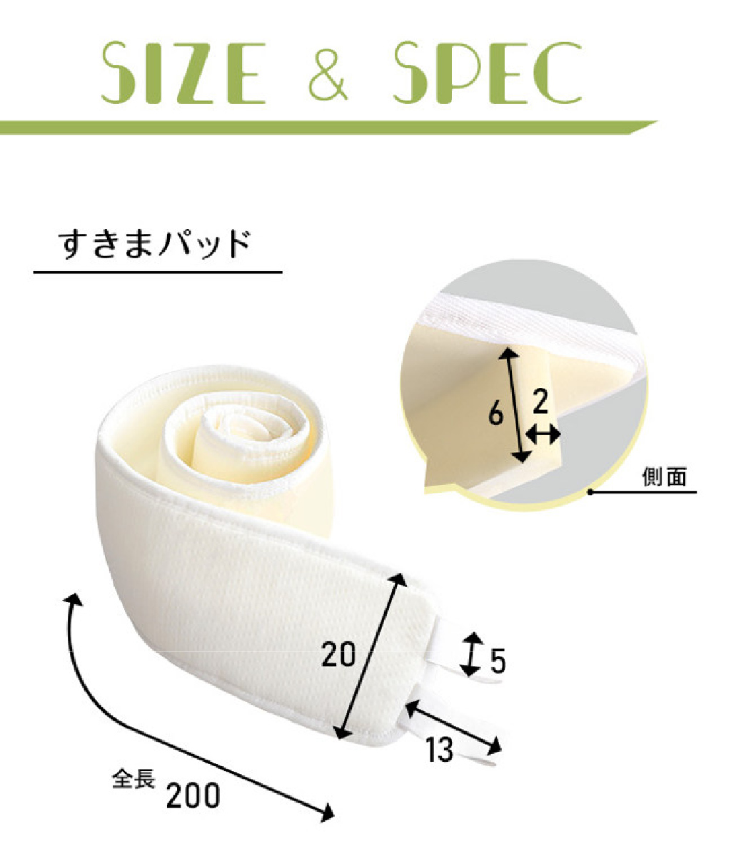 | サイズ | 隙間パッド:幅20×全長200×高さ8(cm) ベルト:幅5×全長1000(cm) バックル:幅5(cm) |