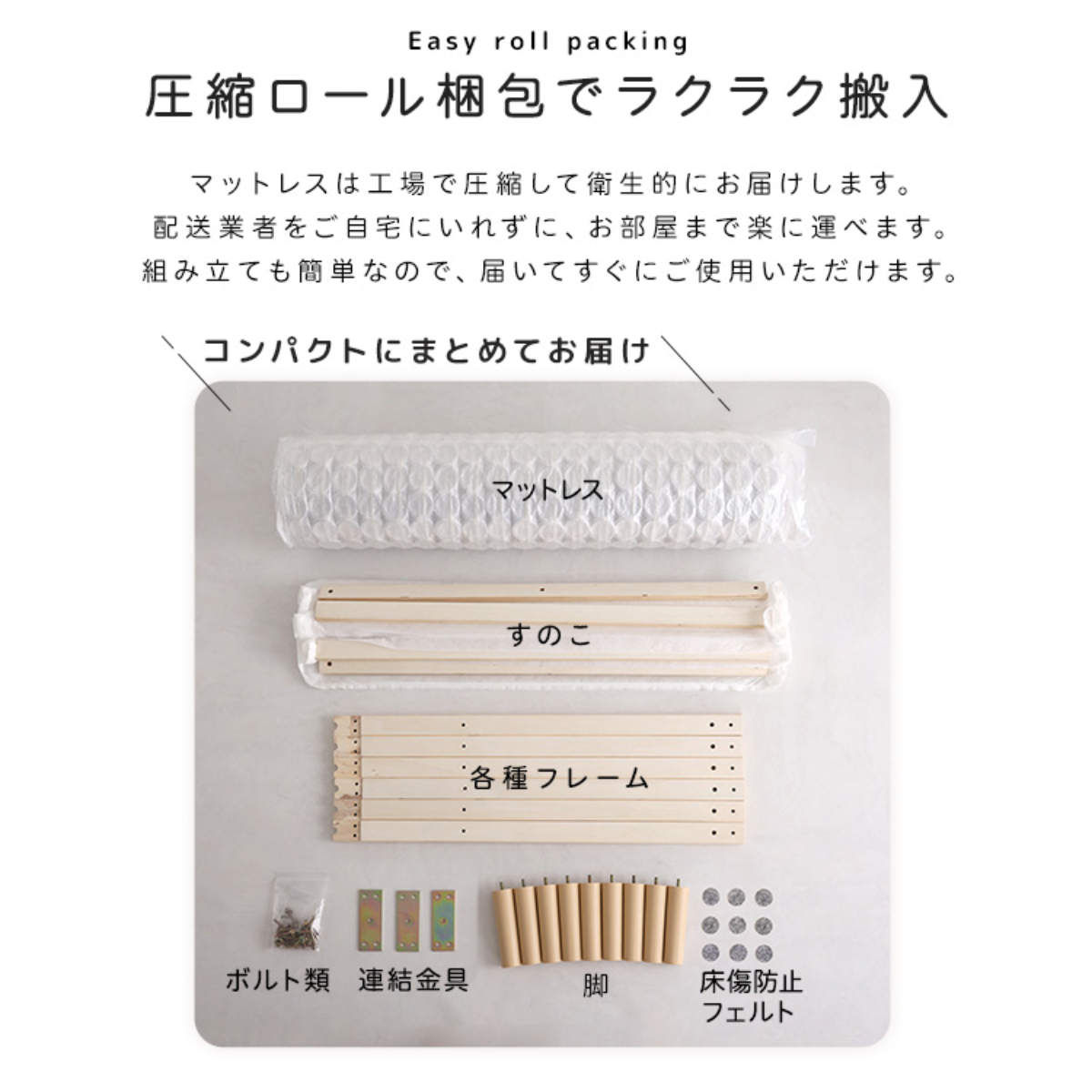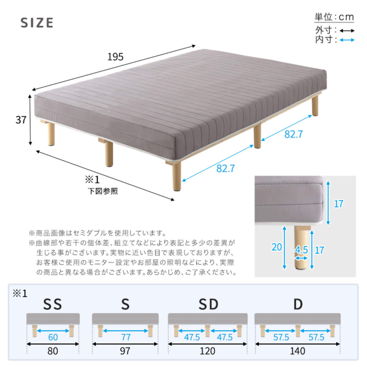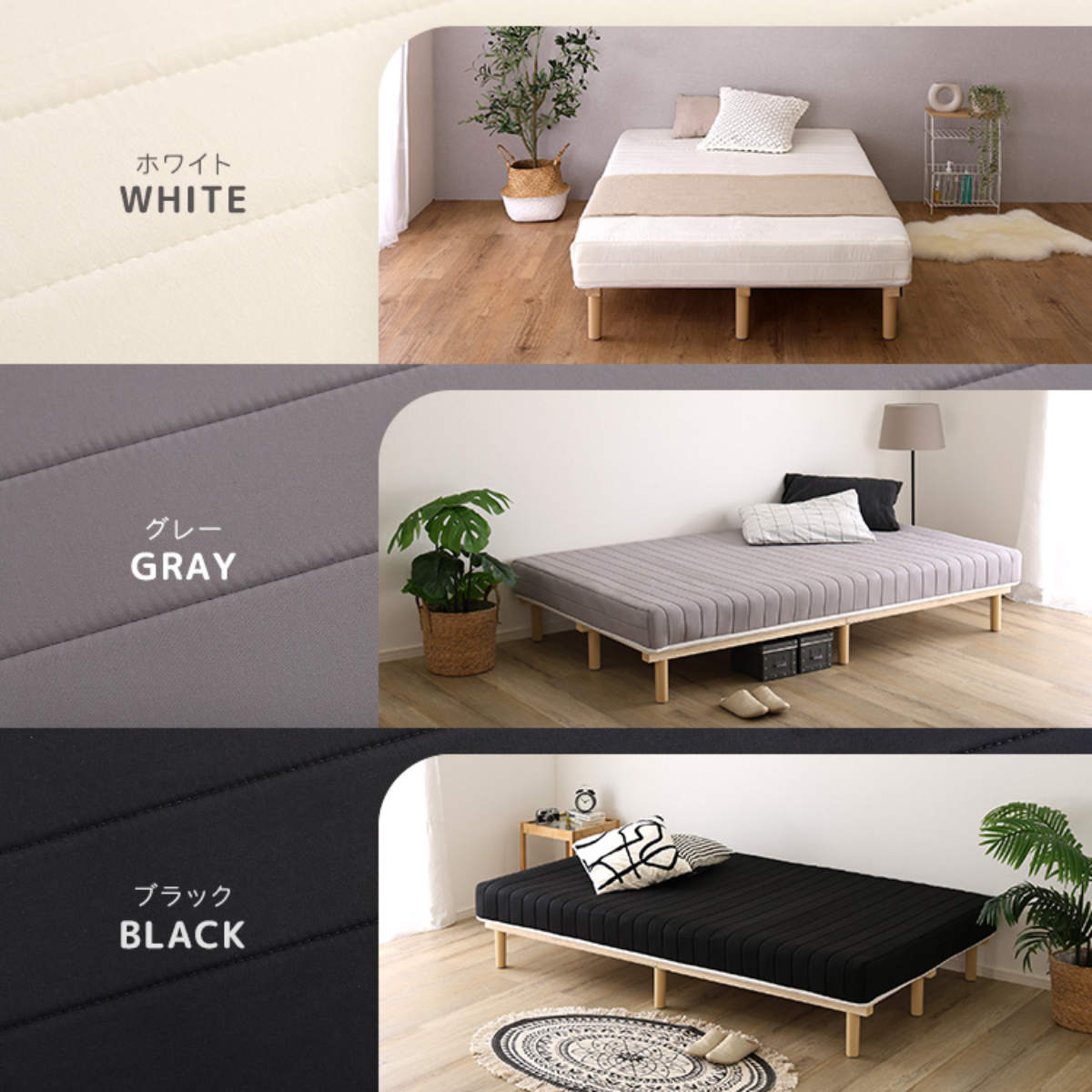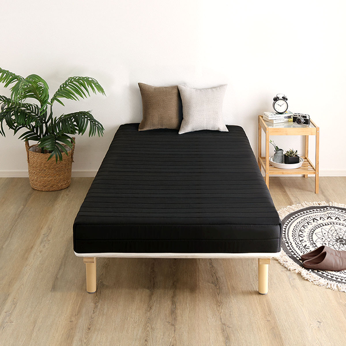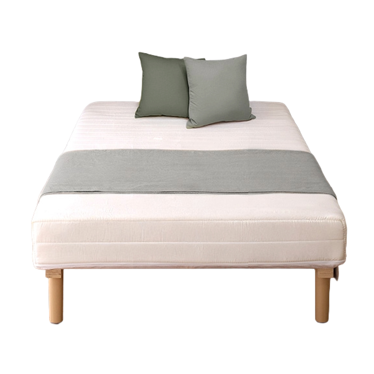 継ぎ目のない、一体型の脚付きマットレスです。良質なマットレスと通気性の良いすのこベッドを一体化した、シンプルに暮らしたい人にぴったりなミニマルデザインです。フレームがないシンプルな構造なので、場所を取らずに設置できます。