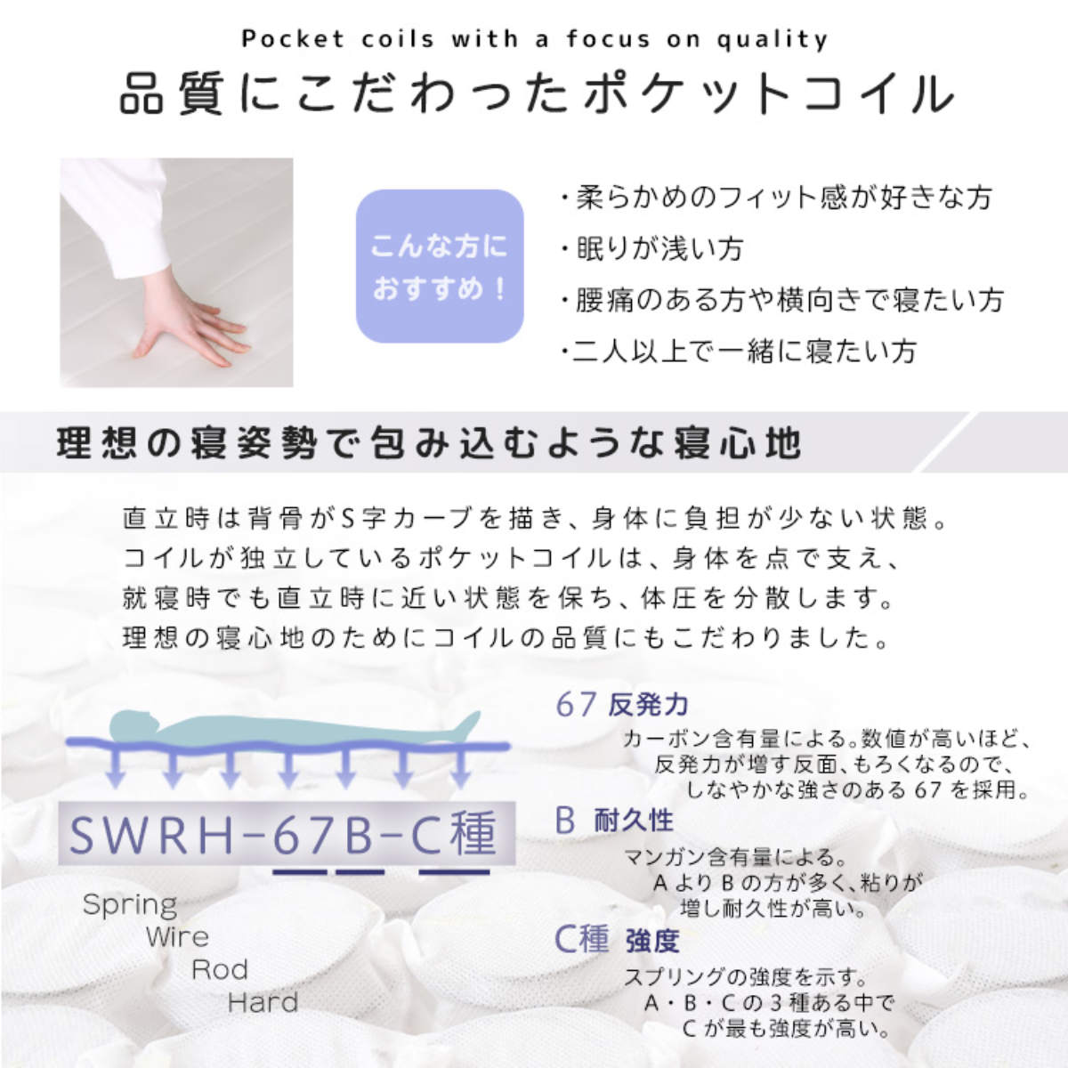 コイルが独立しているポケットコイルは身体を点で支え、就寝時でも直立時に近い状態を保ち、体圧を分散します。理想の寝心地のためにコイルの品質にもこだわりました。