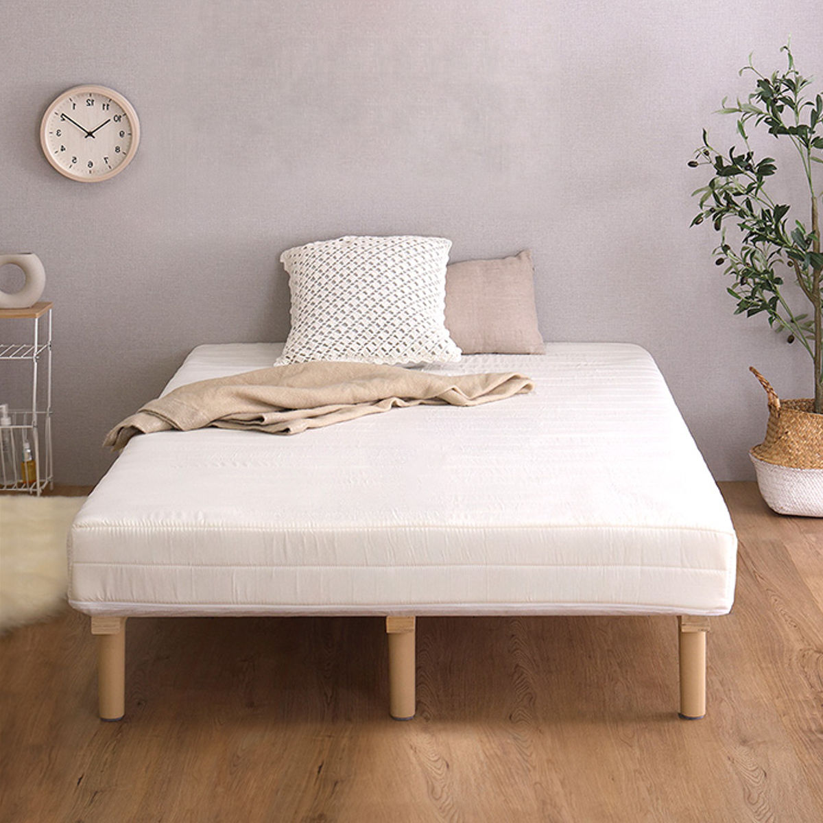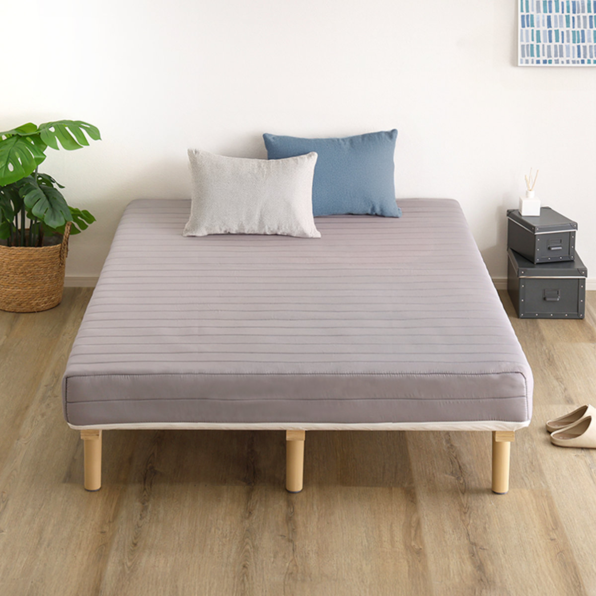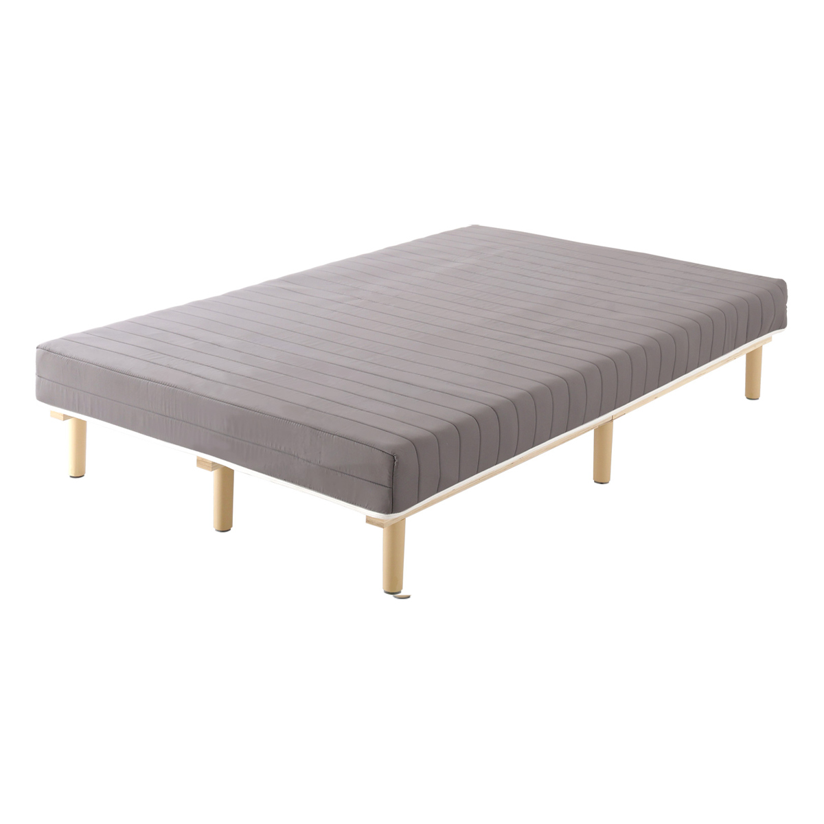 継ぎ目のない、一体型の脚付きマットレスです。良質なマットレスと通気性の良いすのこベッドを一体化した、シンプルに暮らしたい人にぴったりなミニマルデザインです。フレームがないシンプルな構造なので、場所を取らずに設置できます。