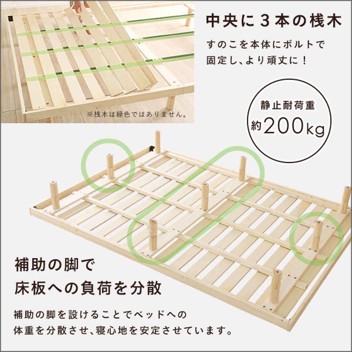 すのこには建築材にも使われるLVL(積層合板)を採用しており、強度が高く、反りにくいのが特長です。厚さ約12mmの設計に加え、中央3本の桟木とボルト固定でしっかり補強、静止耐荷重約200kgの安心構造で、安定した寝心地を支えます。