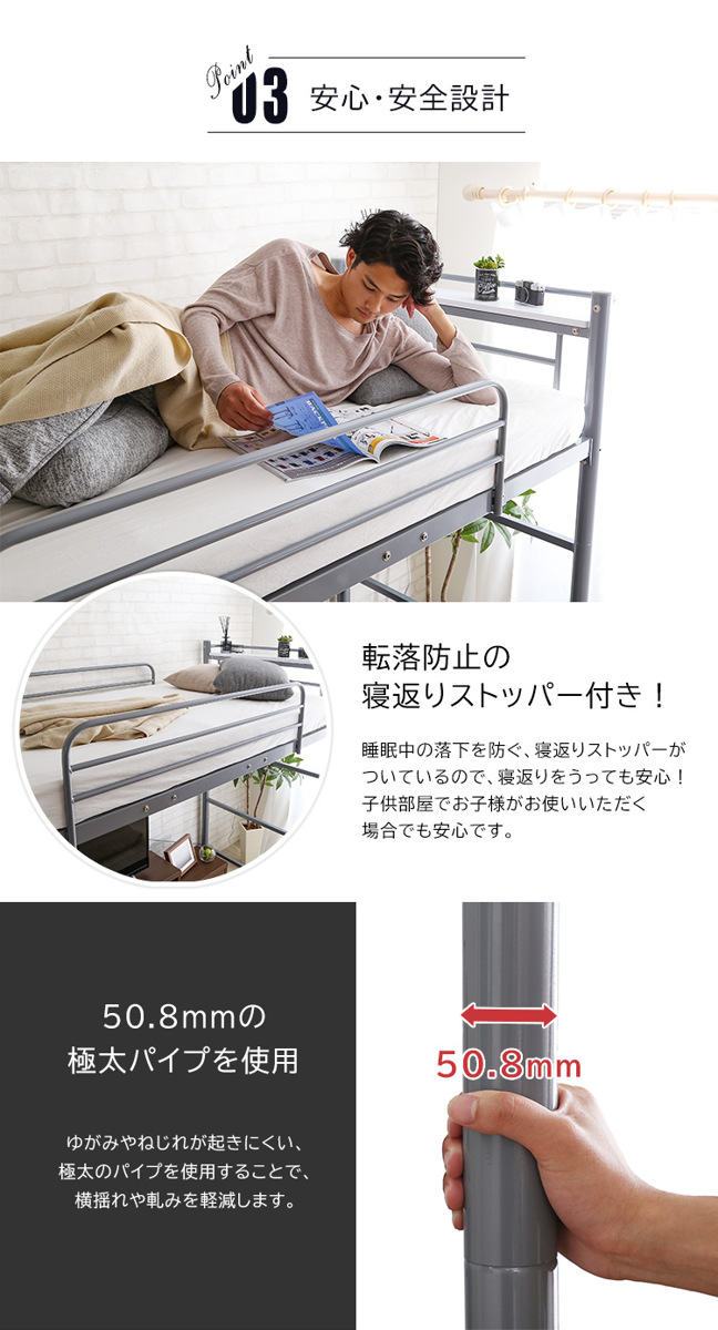 寝返りでの落下や布団のずれ落ちを防ぐストッパーがサイドに付いているので、安心してお休みいただけます。