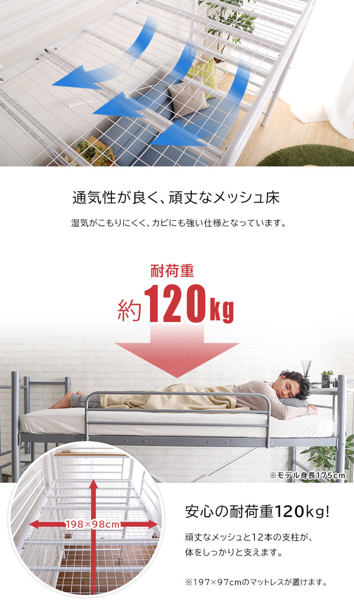 床全面はメッシュ仕様で湿気がこもりにくく、通気性に優れています。幅5.08cmの極太パイプと12本の支柱がしっかり支えることで、横揺れやたわみに強い安定構造を実現しました。耐荷重は安心の120kgです。
