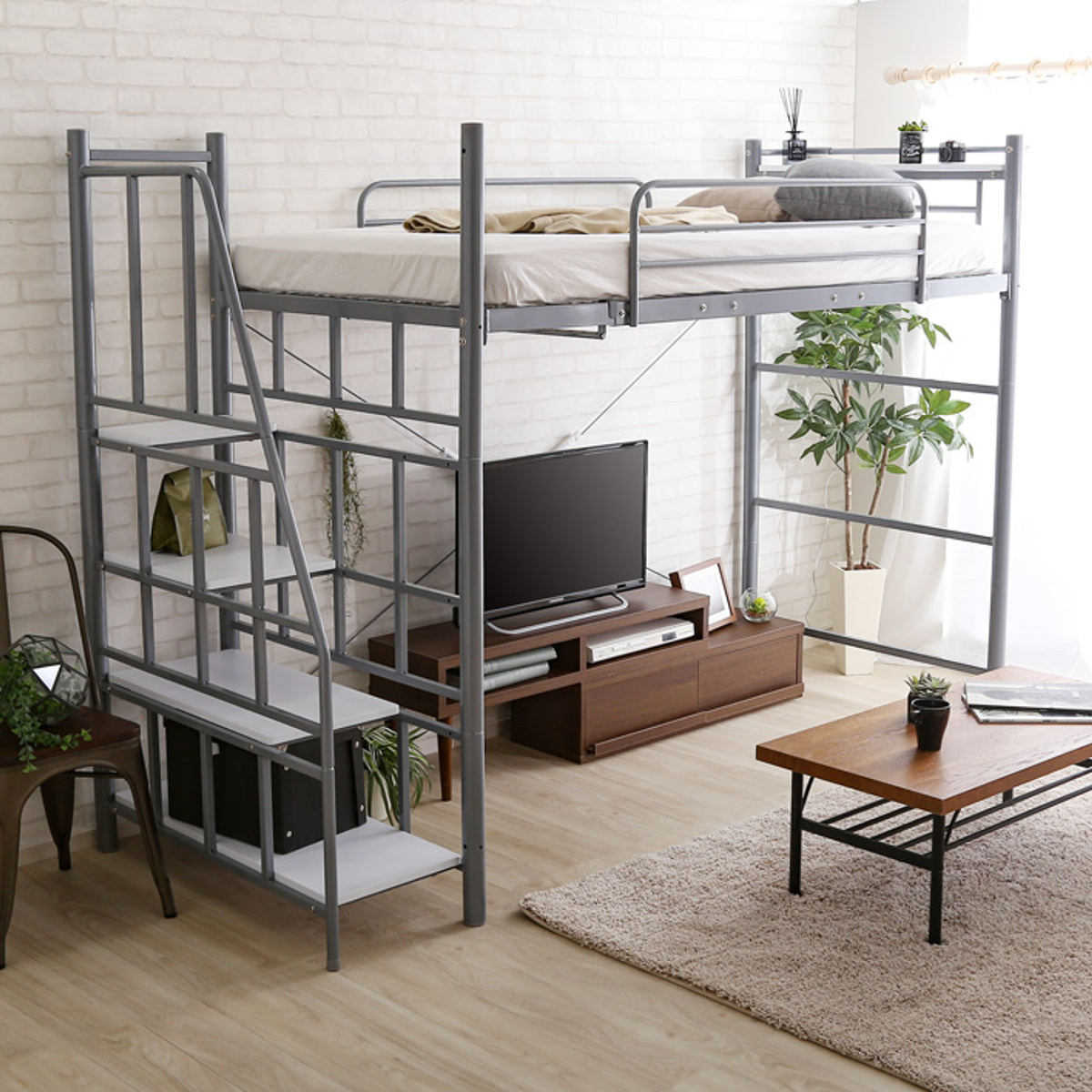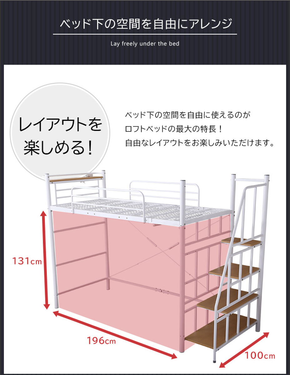 空間を有効活用できるロフトベッドは、スペースが限られたワンルームや一人暮らしのお部屋にぴったり。ベッド下の広々としたフリースペースを活かして、自由なレイアウトを楽しめます。