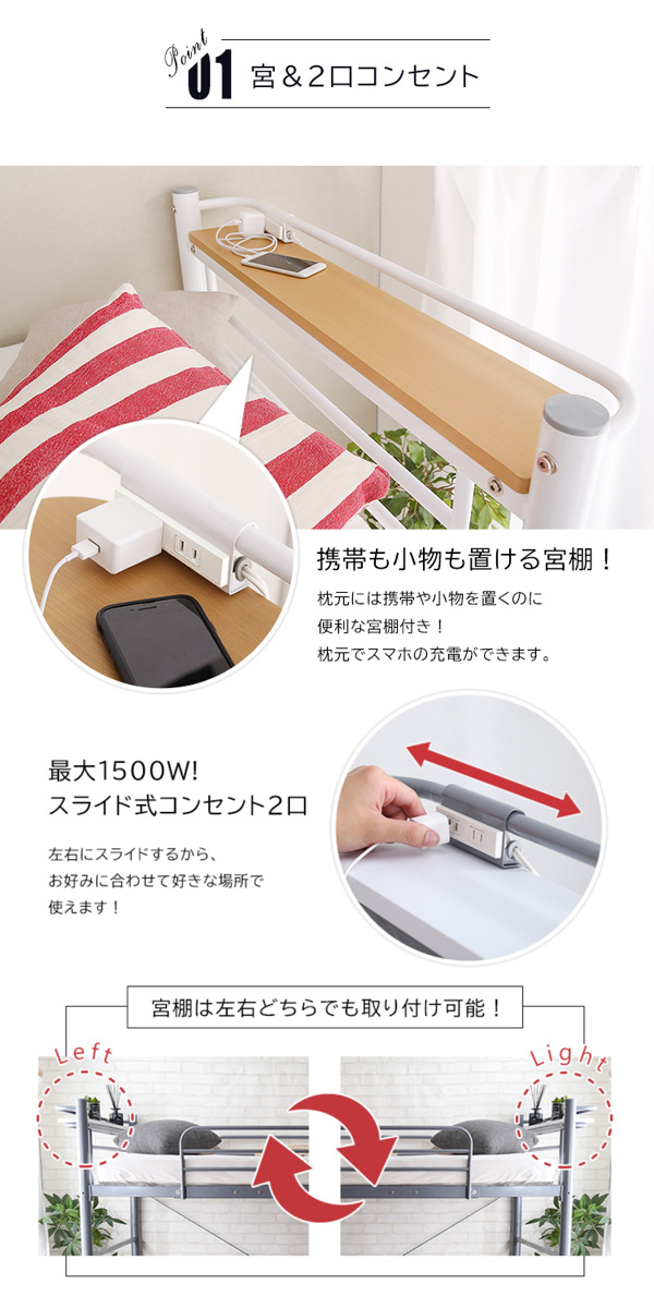 ロフトベッドは、メガネやスマートフォンなどの小物を手の届く枕元に置ける宮棚付き。合計1500Wまで対応の2口コンセントも備えており、スマートフォンやタブレットの充電にも便利です。コンセントは左右にスライドできるため、お好みの位置でお使いいただけます。