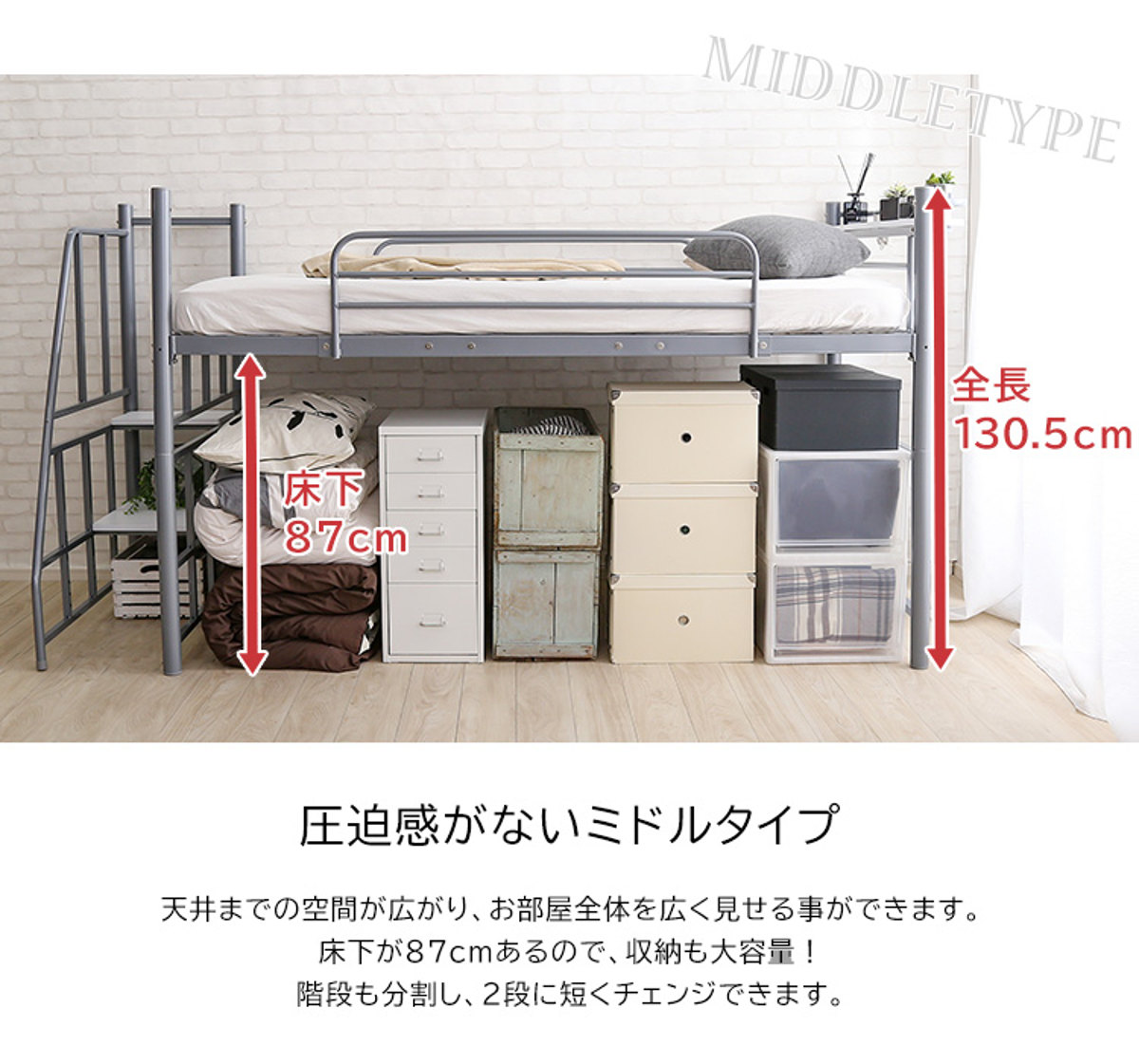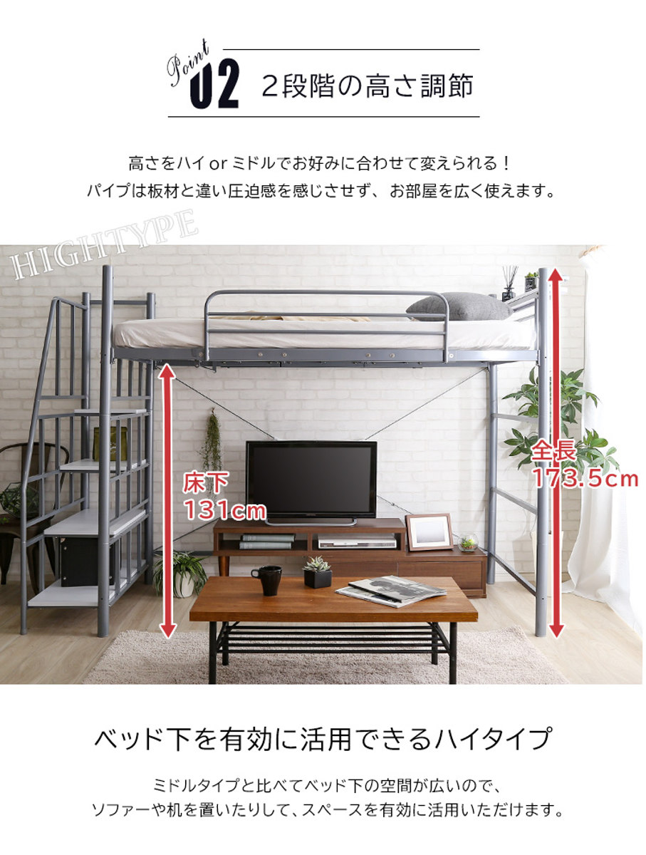 ロフトベッドは、「ハイタイプ」と「ミドルタイプ」の2段階で高さ調節が可能です。お部屋の広さや使い方に合わせて設定でき、暮らしにフィットした空間づくりができます。