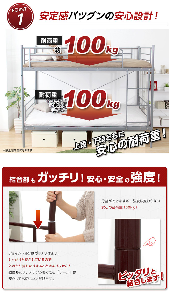 丈夫なスチールパイプを使用し、耐震性・耐久性に配慮したしっかり構造に仕上げました。上下段それぞれ耐荷重100kgの安心設計で、お子さまから大人まで快適にお使いいただけます。
