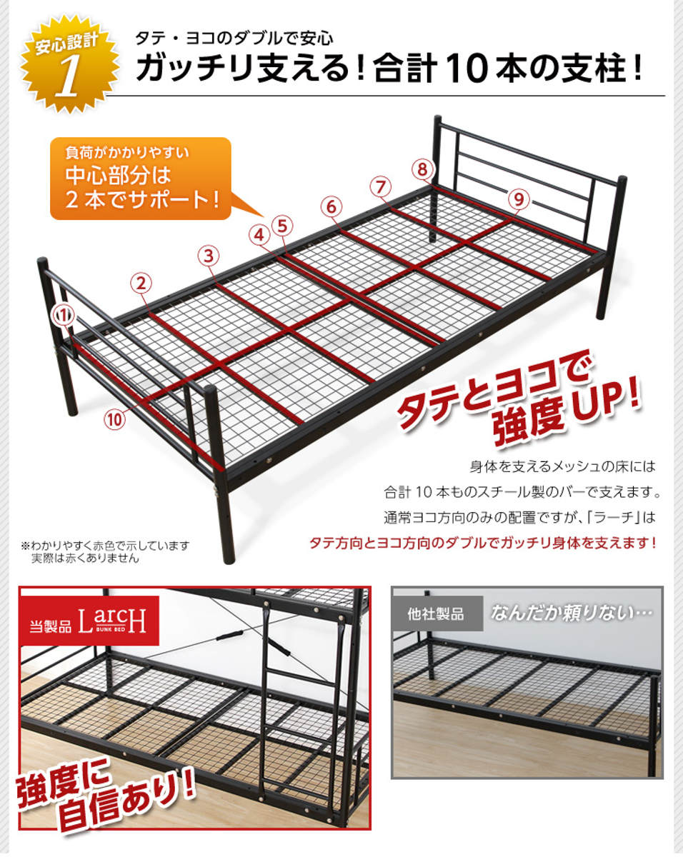 床全面はメッシュ仕様で湿気がこもりにくく、通気性に優れています。タテ方向とヨコ方向に交差した合計10本の支柱がしっかり支えることで、横揺れやたわみに強い安定構造を実現しました。