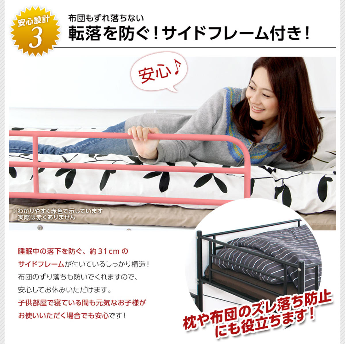 高さ約31cmのサイドフレームを採用し、従来よりもしっかりとした安心設計に仕上げました。寝返りによる落下を防ぎ、寝相が気になるお子様でも安心してお休みいただけます。枕や布団のずれ落ちも防ぎ、気持ちよくお休みいただけます。