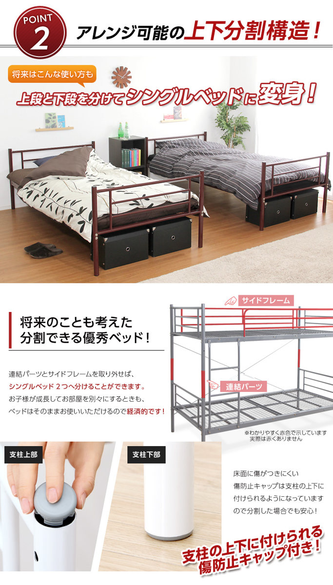 上下分割構造で、連結パーツとサイドフレームを取り外せば、それぞれをシングルベッドとして使用できます。お子様の成長やライフスタイルの変化に合わせて長く使え、買い替えの手間や費用を抑えられるお得な設計です。