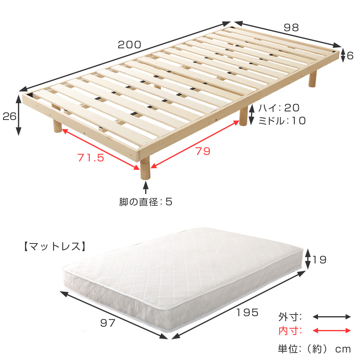 | サイズ | ベッド:約 幅98×奥行200×高さ6/16/26(cm) マットレス:約 幅97×奥行195×高さ19(cm) |