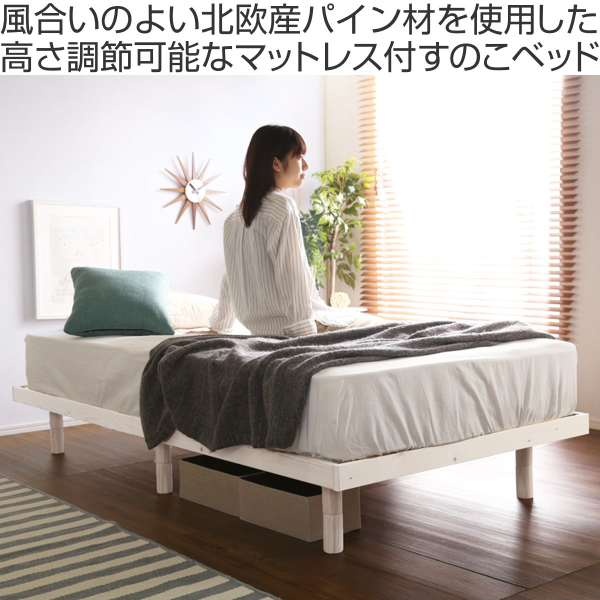 | 材質 | 【ベッド】 本体:天然木(パイン材) すのこ:合板(LVL) 表面材:ラッカー塗装(ホワイトウォッシュ、ブラウン)、無塗装(ナチュラル) 【マットレス】 張り材:ポリエステル100% クッション材:ポケットコイル、ウレタンフォーム、不織布 |