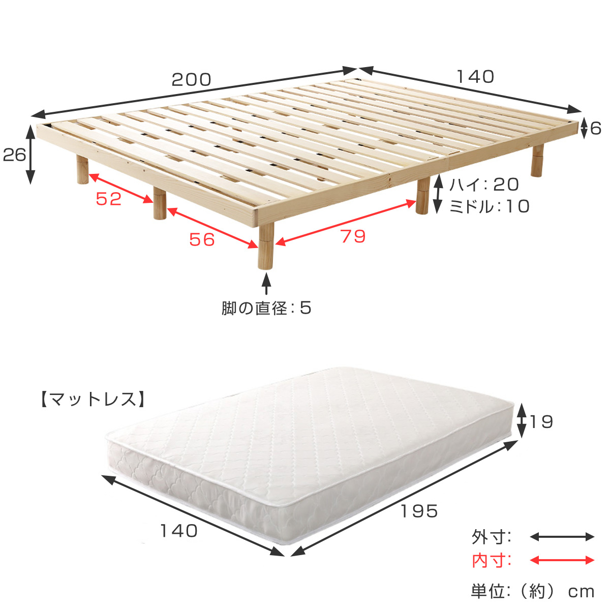 - ベッド:約幅140×奥行200×高さ6/16/26cm