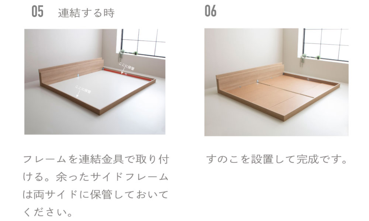 シンプルなフレーム設計なので、ベッドを並べて広々と使うことも可能です。ご夫婦での使用はもちろん、お子さまと一緒に眠るファミリーベッドとしてもおすすめです。ライフスタイルの変化に合わせて柔軟にお使いいただけます。
