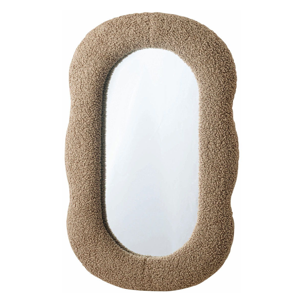 もこもことしたボリューミーなファブリックフレームが印象的なウォールミラーです。個性的なフォルムながら、やさしげなニュアンスカラーで上品な雰囲気に仕上げました。
