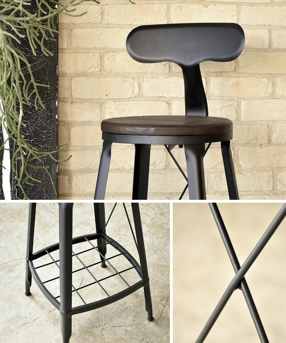 ウッドとスチールを組み合わせた、どこか懐かしさを感じるデザインのハイチェア。使い込んだような風合いが空間になじみつつ、インテリアのアクセントとしても映えるデザインです。