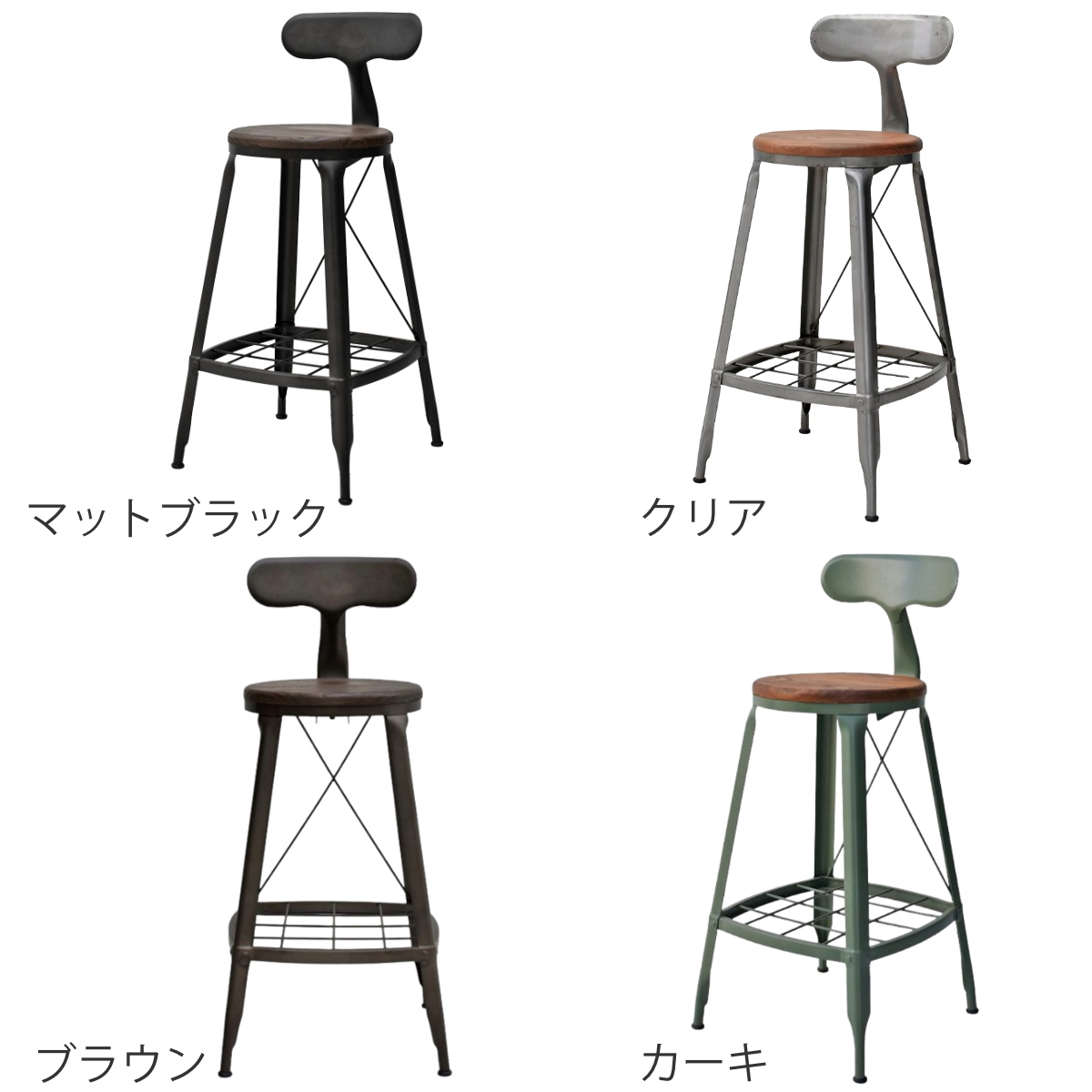 カラーはマットブラック・カーキ・ダークブラウン・クリアの4色で、スチールの質感が活かされたカラー展開です。カラーによって座面の色合いも異なり、インテリアやテーブルの雰囲気に合わせて選べます。