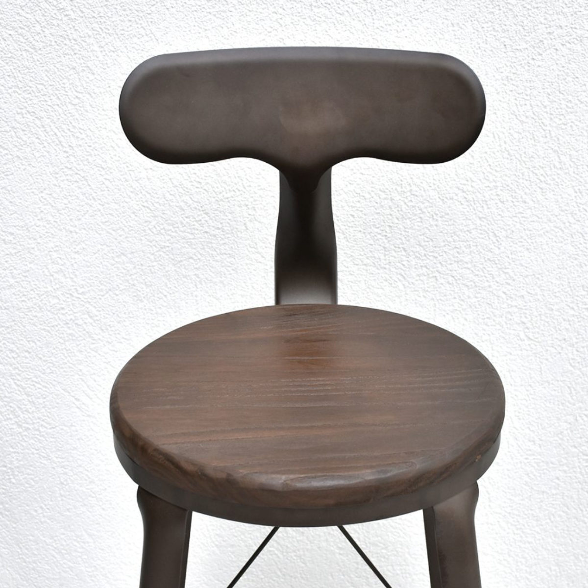 座面にはニレ材(エルム材)を使用した天然木の座面を採用。木目の表情が一つひとつ異なり、スチールとの組み合わせが温かみのあるインダストリアルな印象をつくります。