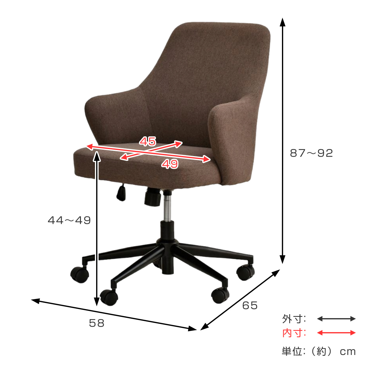 | サイズ | 約 幅58×奥行65×高さ87~92(cm) 座面高:44~49(cm) |