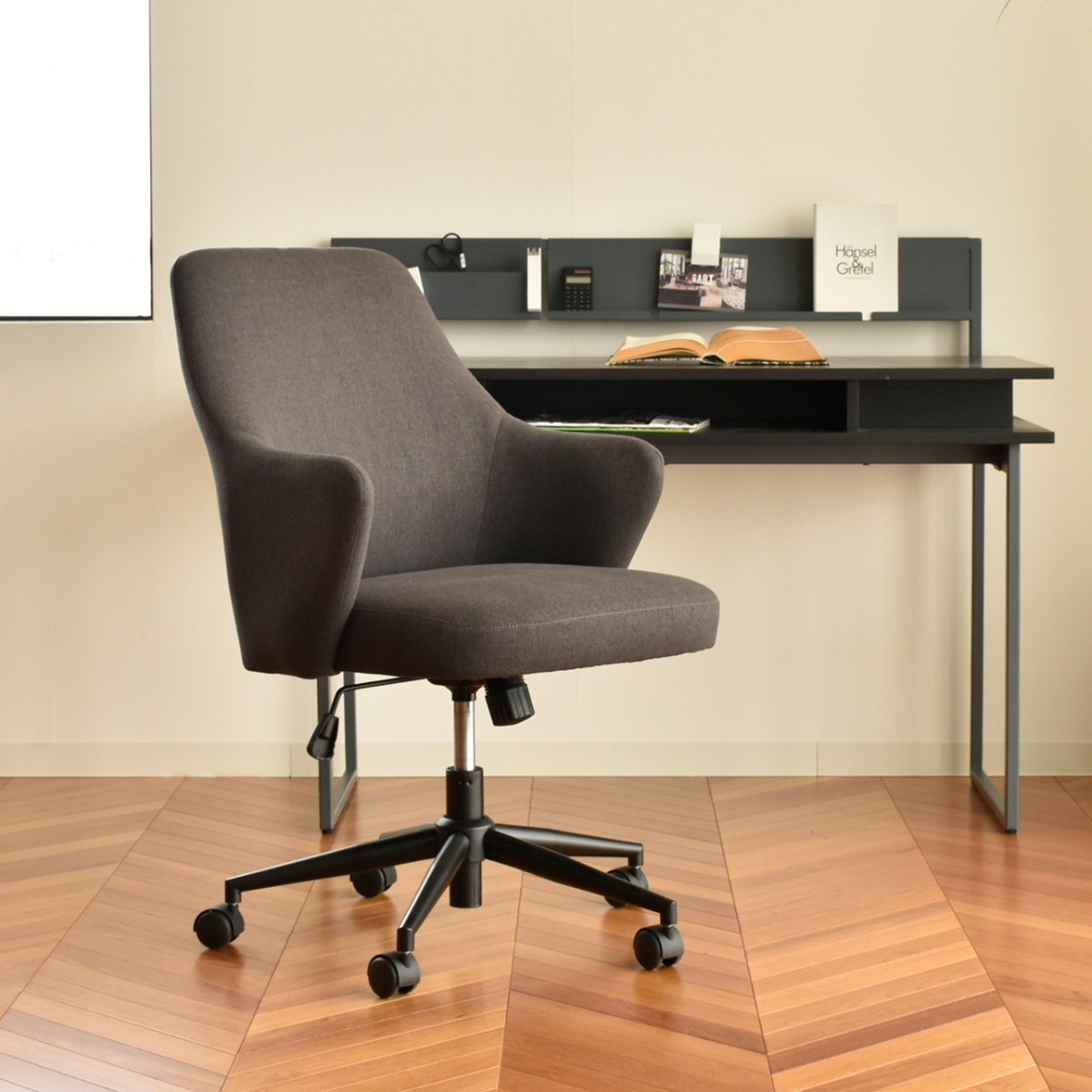 在宅ワークやオフィス環境など、様々なシーンで使いやすい昇降式でキャスター付きの機能が充実したチェアです。すっきりと無駄のないフォルムと落ち着いたトーンがモダンな印象を与え、ワークスペースをさりげなくおしゃれに整えます。