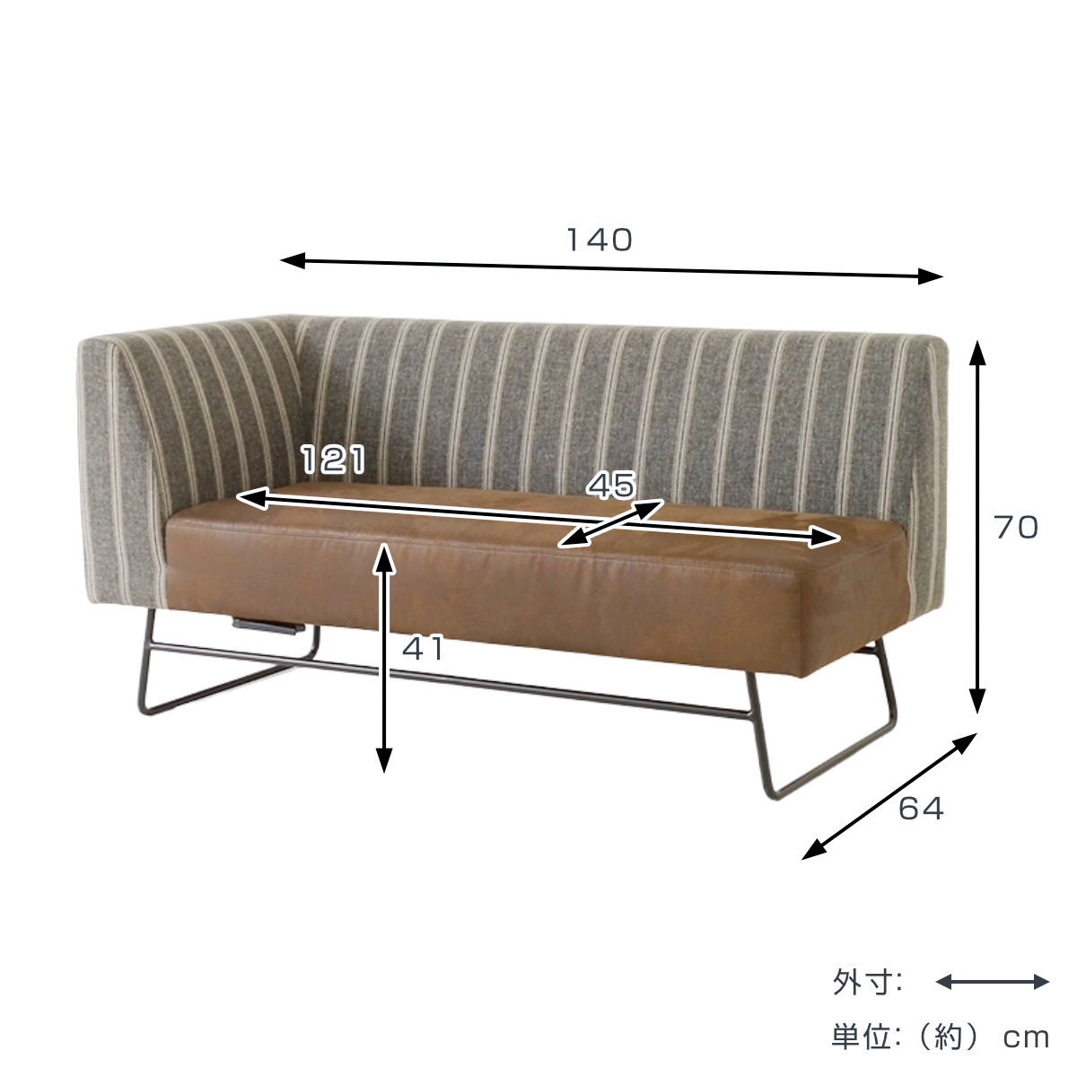 | サイズ | 約 幅140×奥行64×高さ70(cm) 座面高:約 41(cm) 座面サイズ:約 幅121×奥行45(cm) |