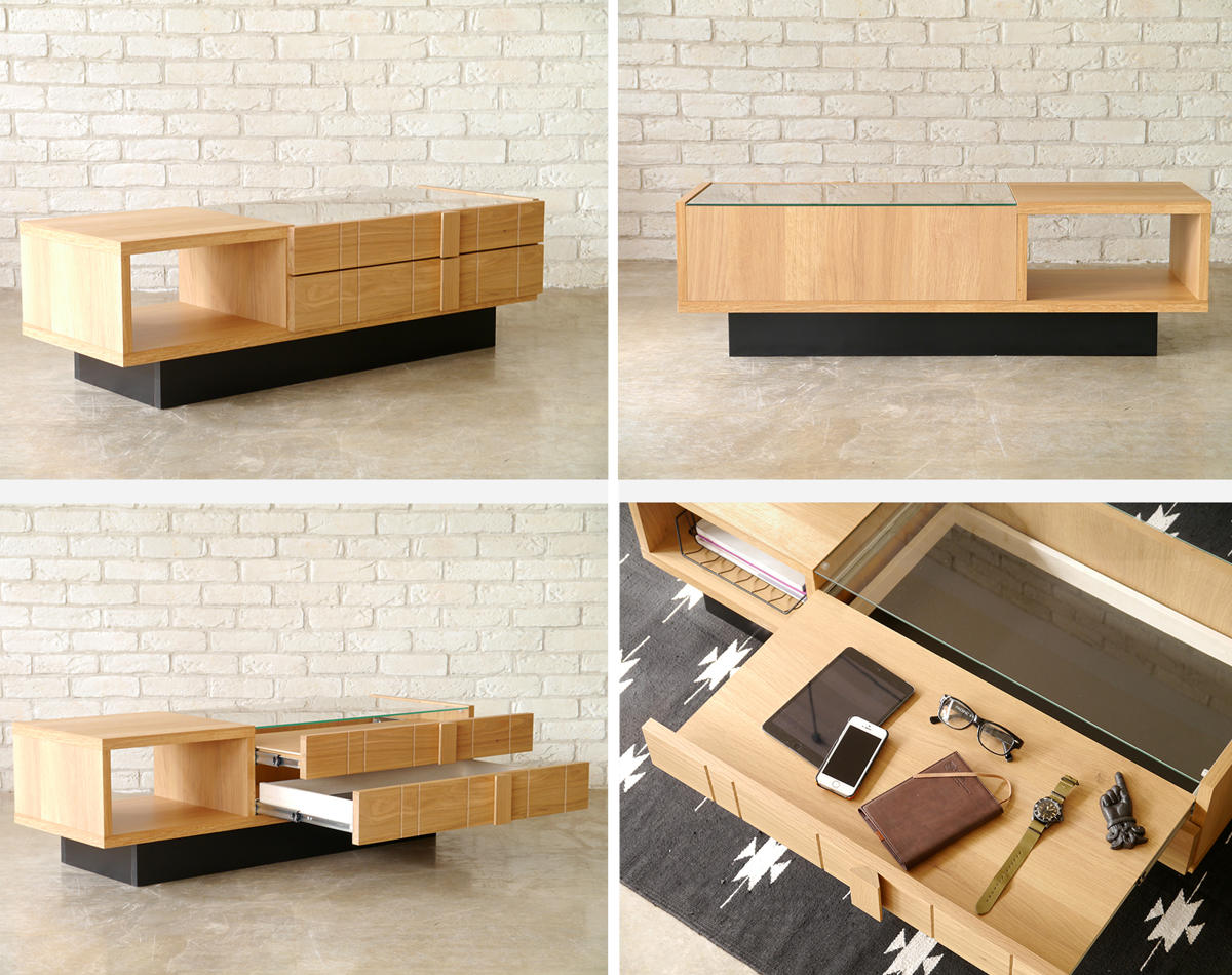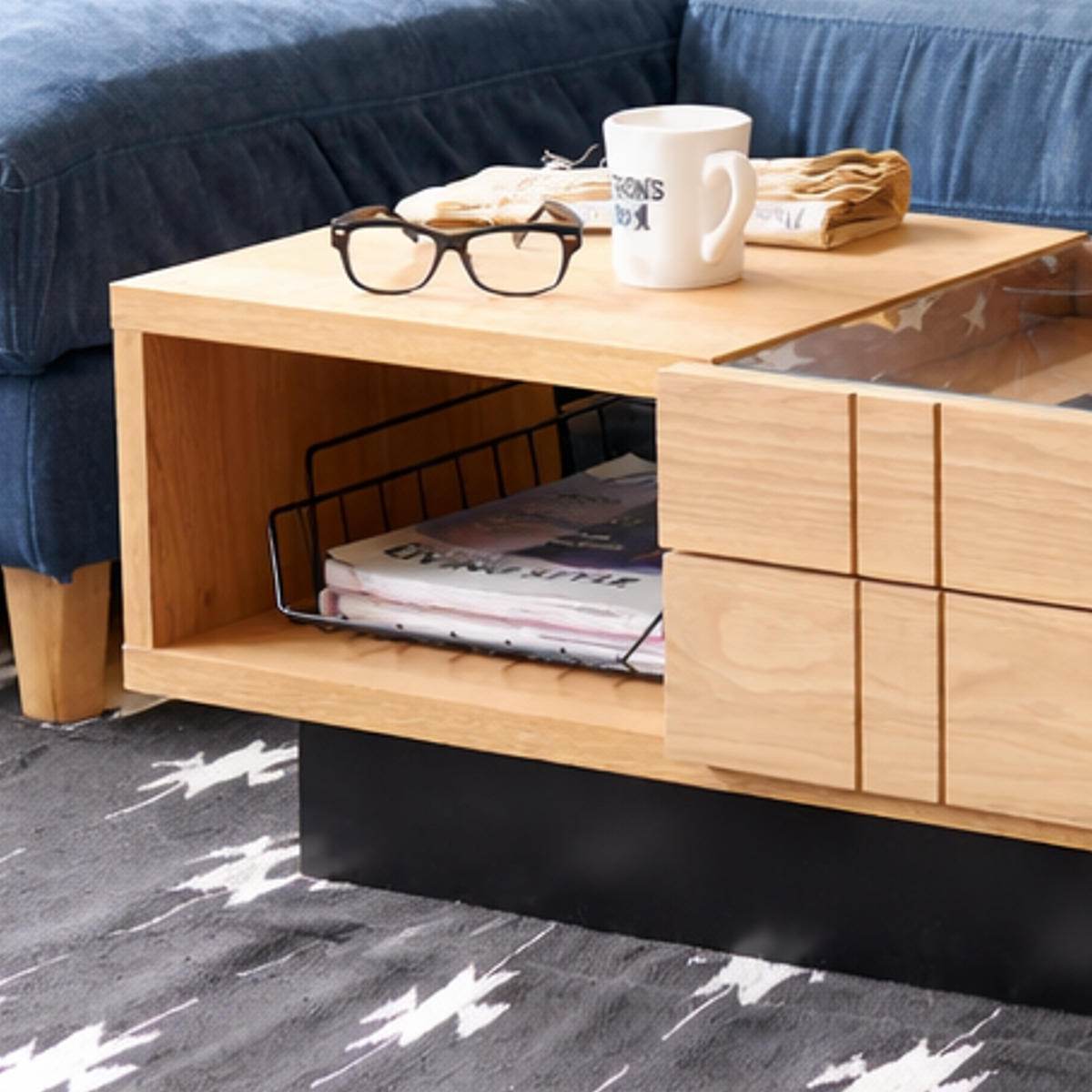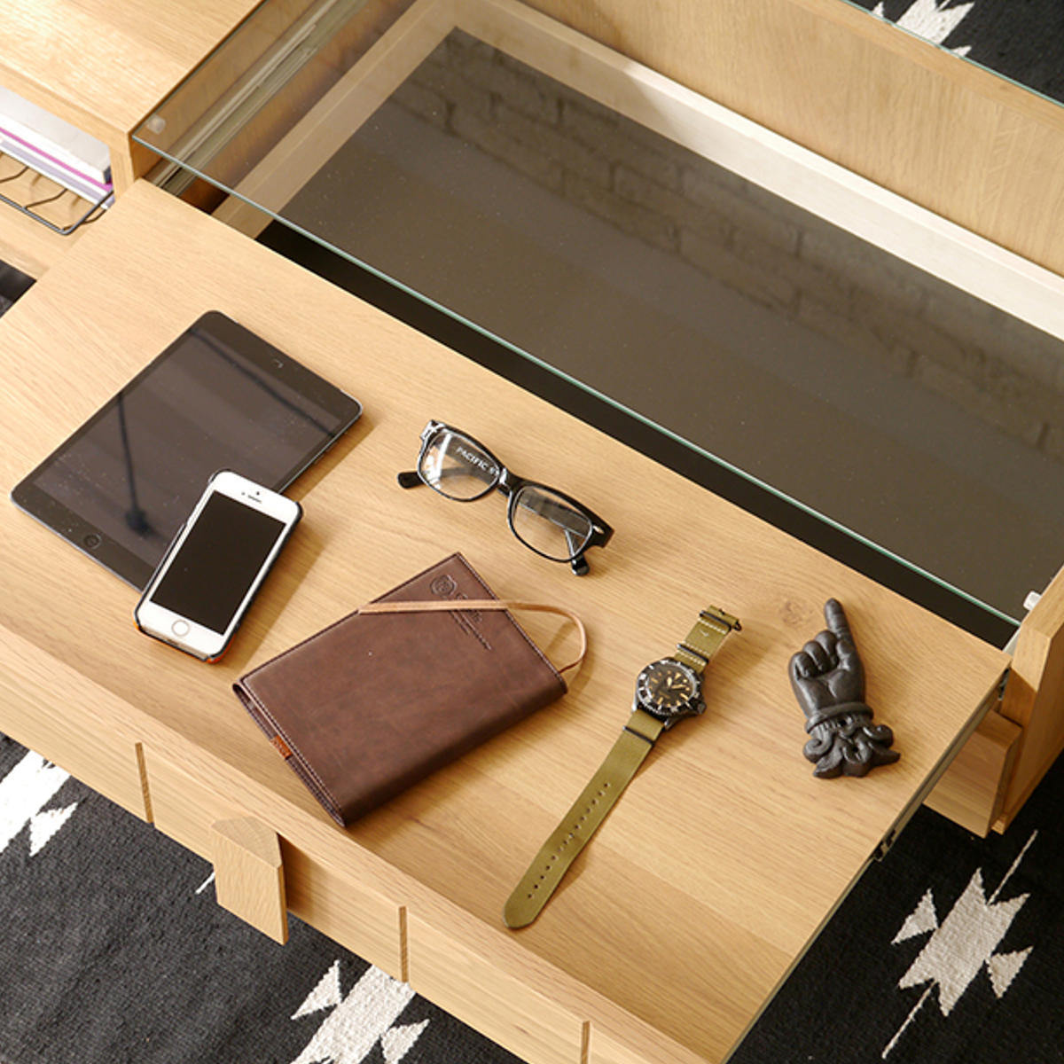 ガラス仕様の天板下はディスプレイスペースとして活用可能。お気に入りの時計や雑貨、雑誌などを美しく飾りながら収納できます。スライド式なので出し入れもスムーズに行えます。