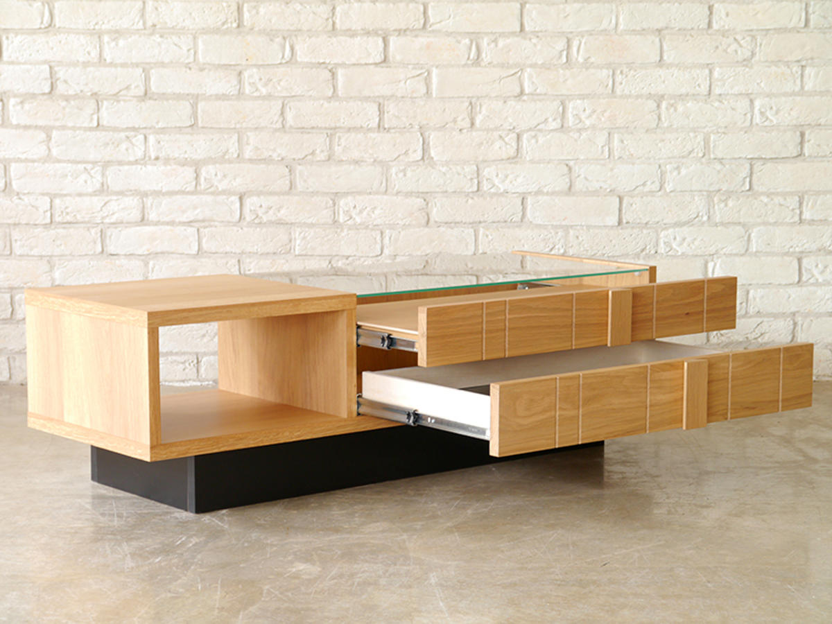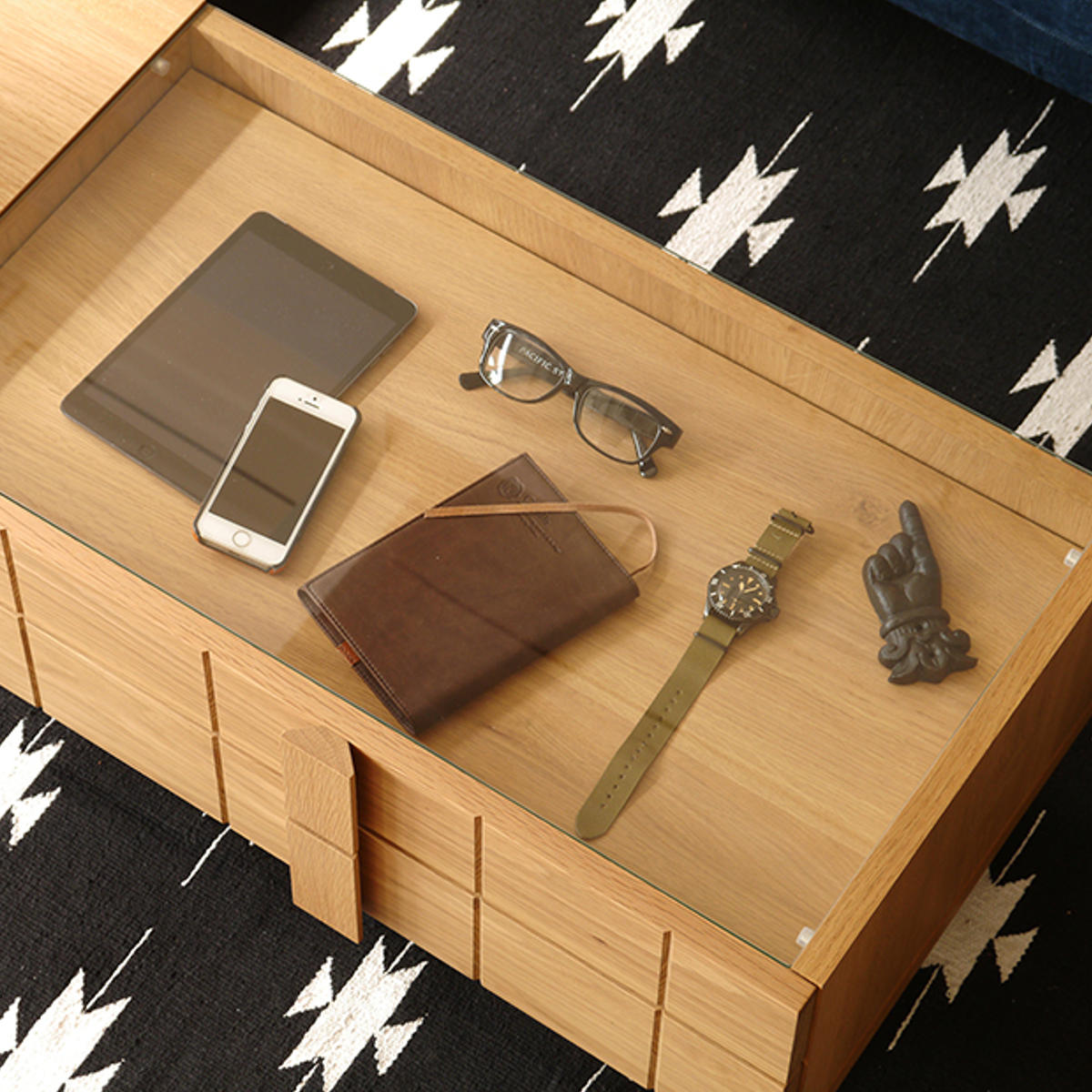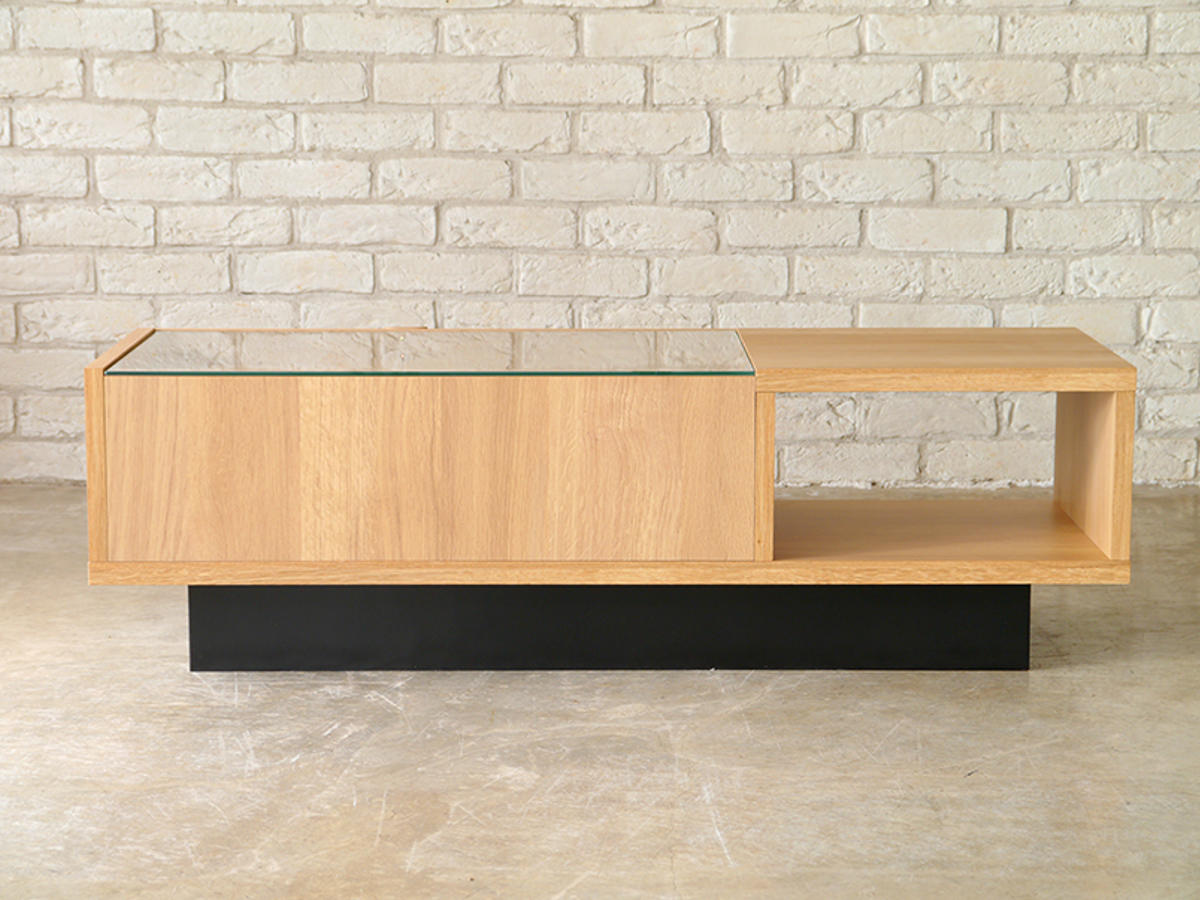 ガラス仕様の天板下はディスプレイスペースとして活用可能。お気に入りの時計や雑貨、雑誌などを美しく飾りながら収納できます。スライド式なので出し入れもスムーズに行えます。