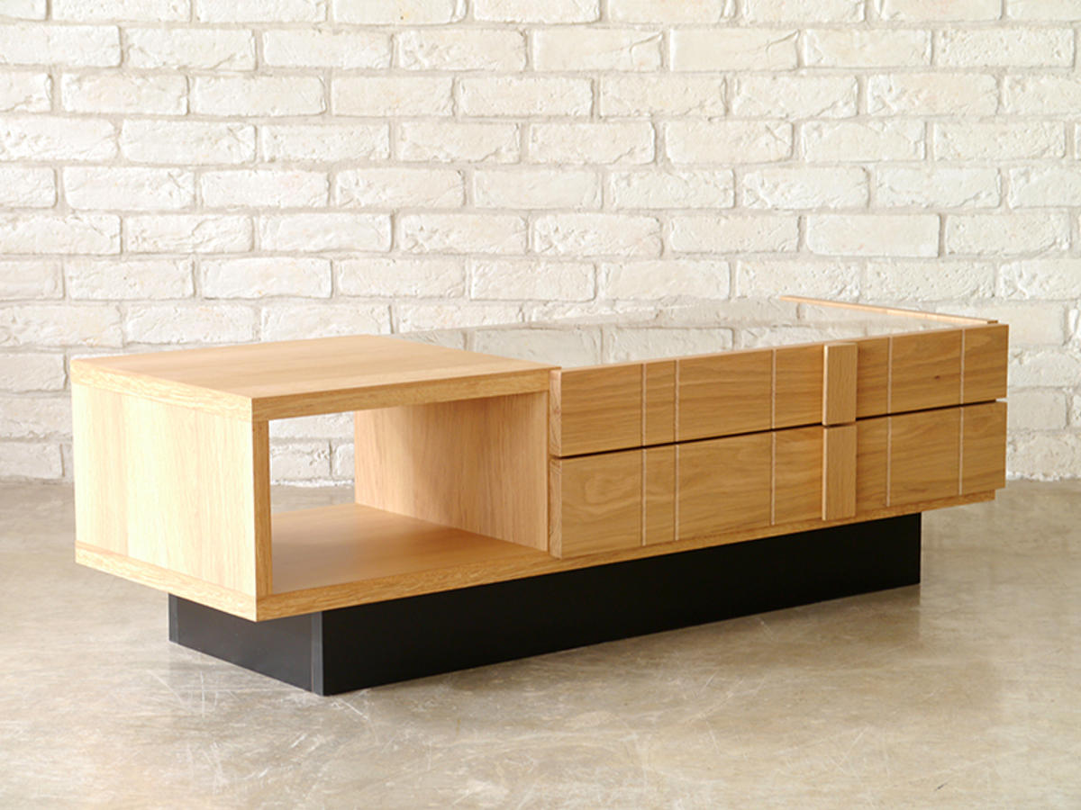 | 材質 | 天板:強化紙、強化ガラス 本体:プリント紙 引出底板:黒プリント紙 引出前板引手:オーク材(ウレタン塗装) |