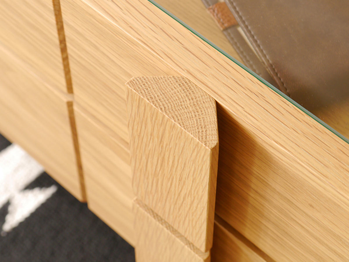 引き出しの前板にはオーク材を使用し、木の風合いをより一層引き立てています。シンプルながらも存在感があり、お部屋のアクセントとしても映えるデザインです。