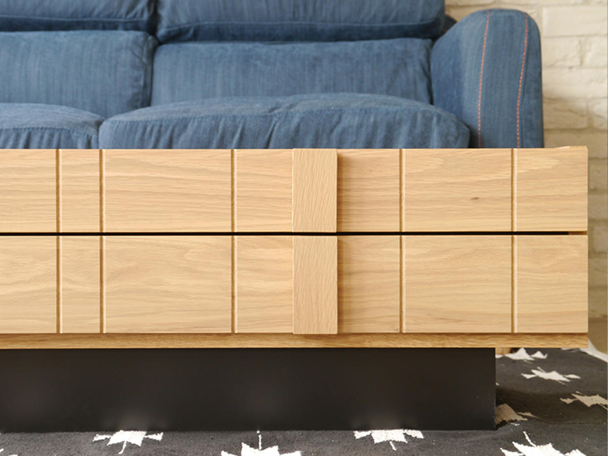 ●引き出しの前板にはオーク材を使用したデザインで、木の温もりを感じられる仕上がりです。