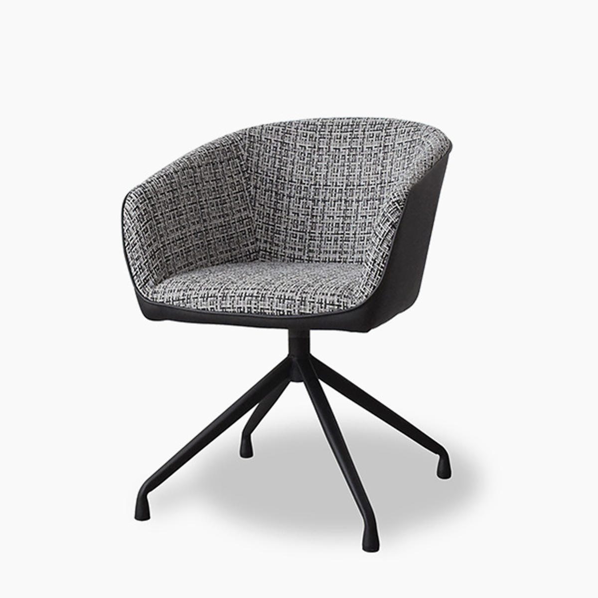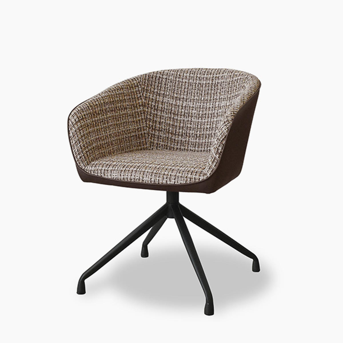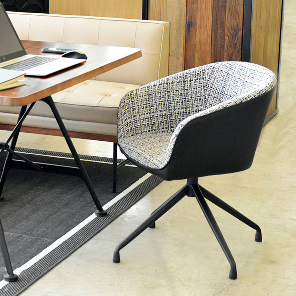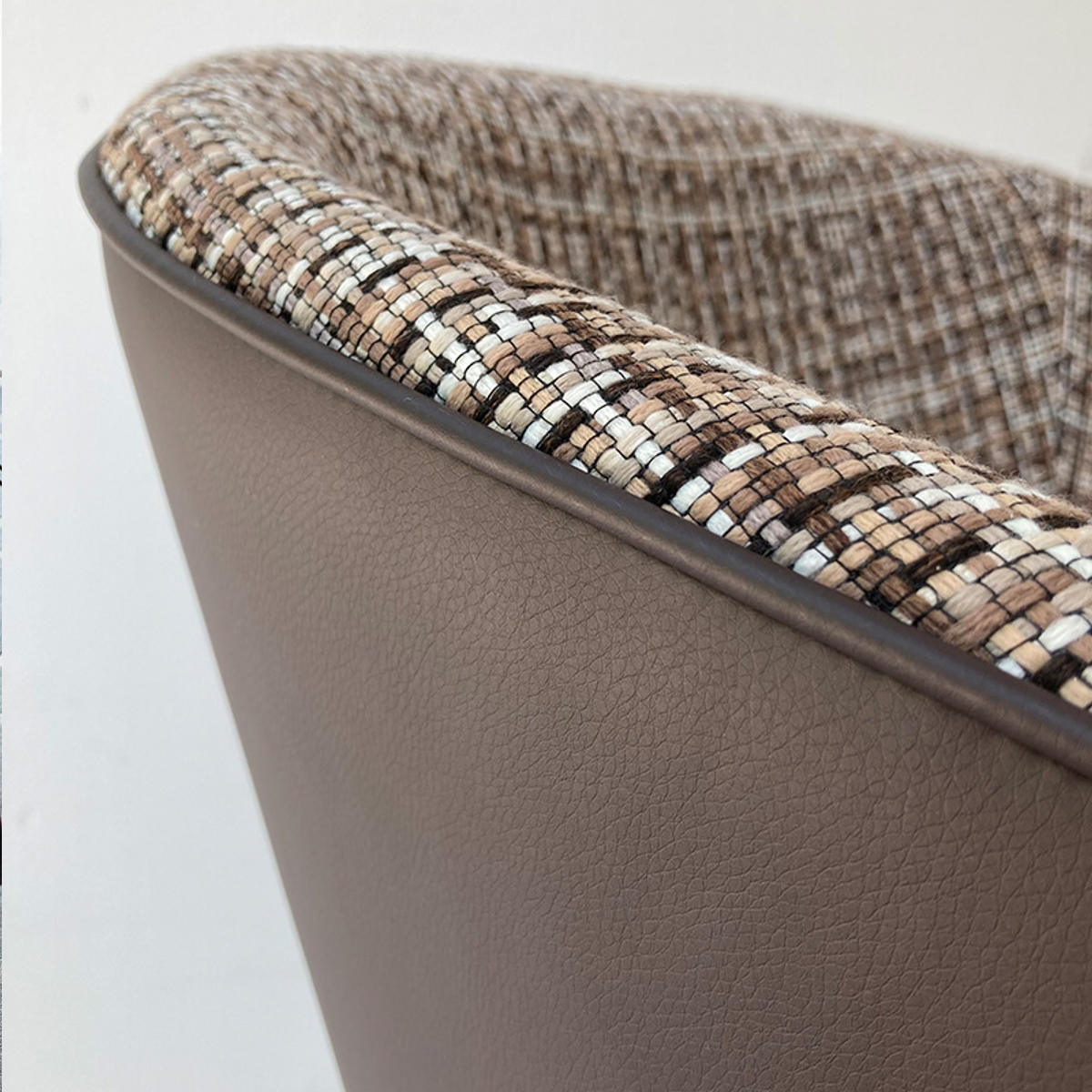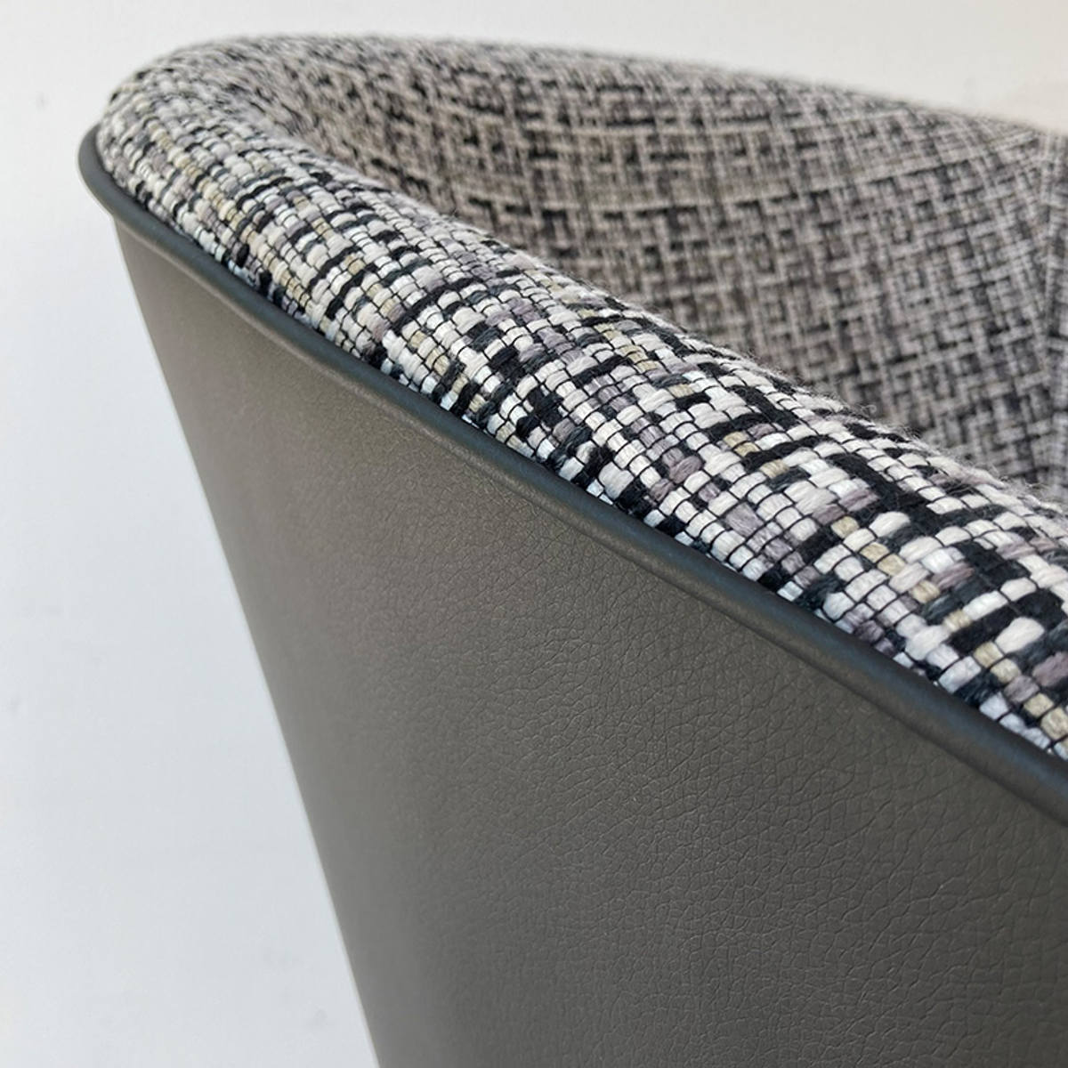 座面内側には複数の色を織り込んだ表情豊かなファブリックを使用。側面には合成皮革を組み合わせることで、質感のコントラストが際立ち、洗練されたモダンな印象に仕上げています。