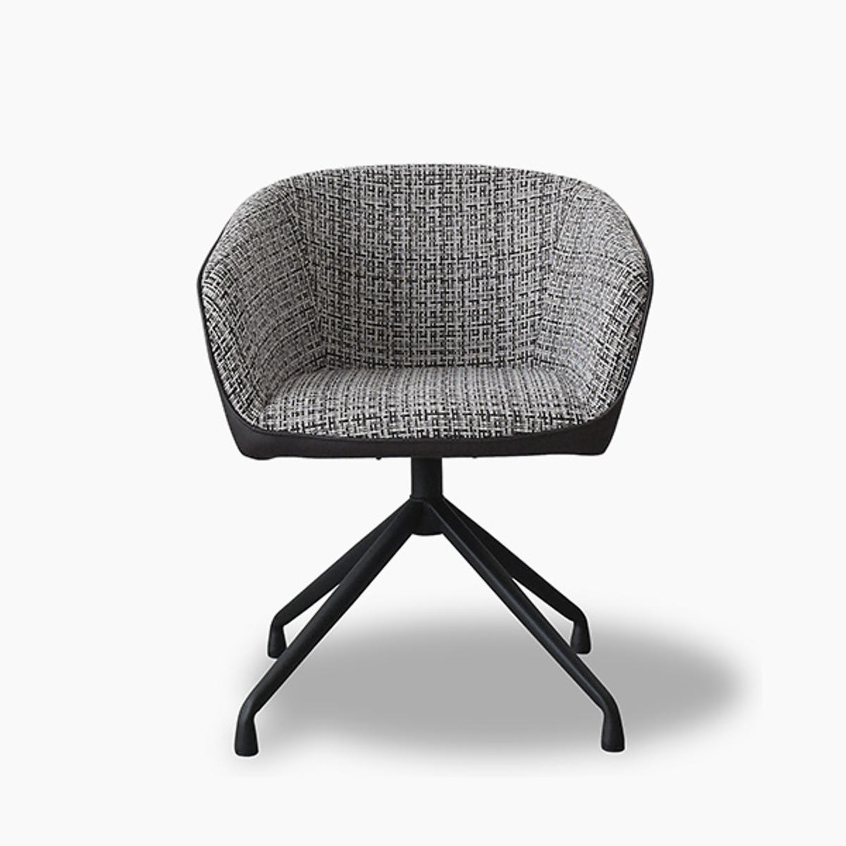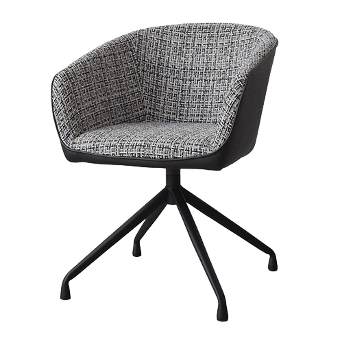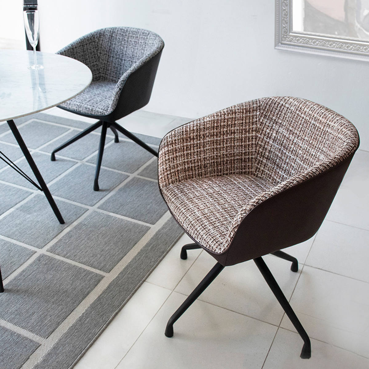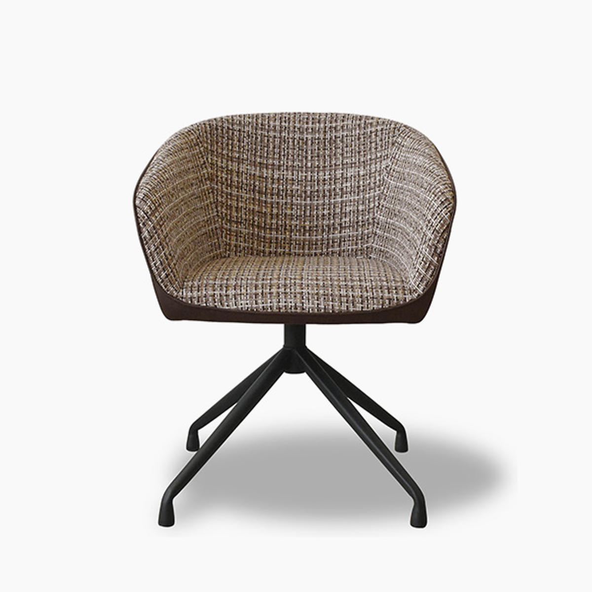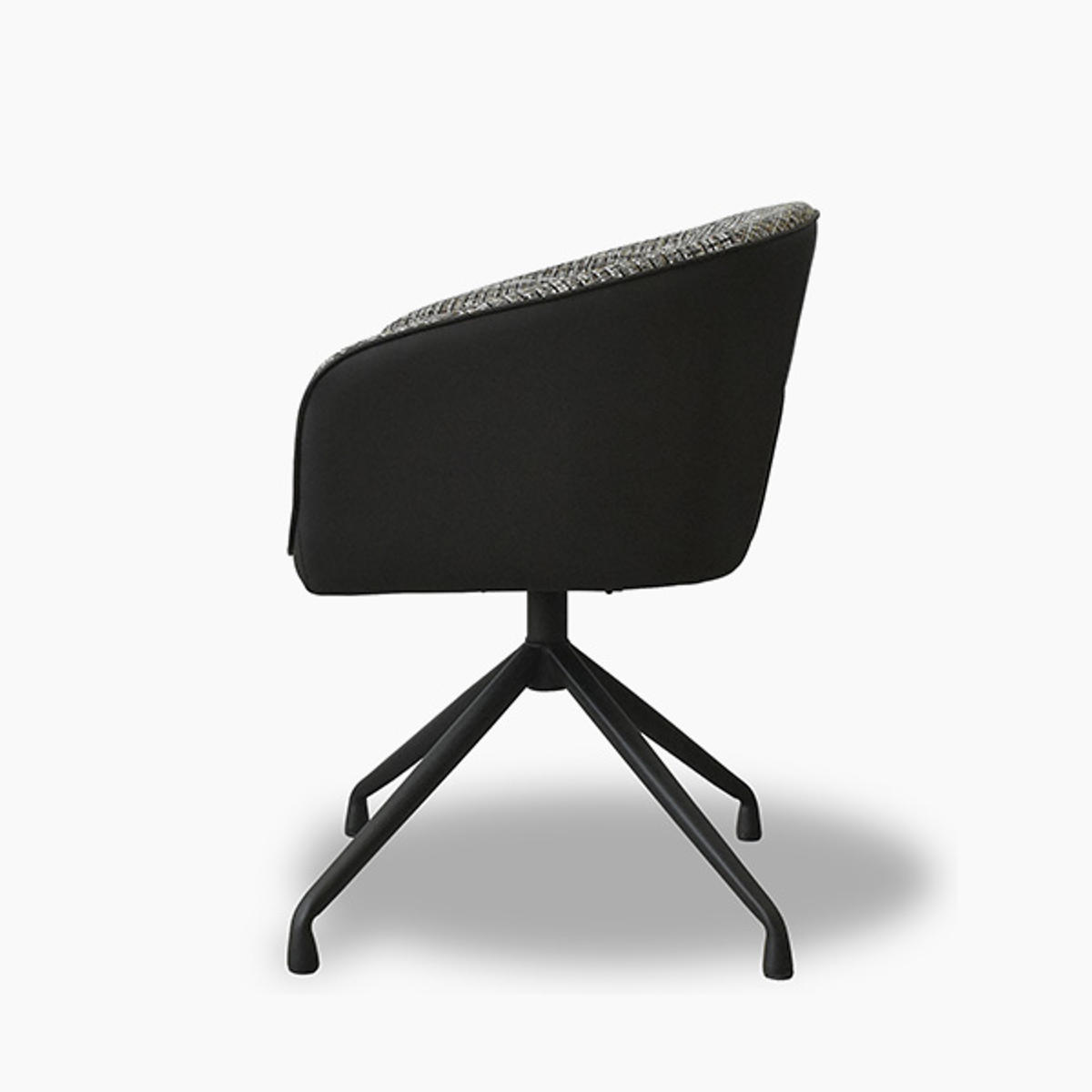 座面内側には複数の色を織り込んだ表情豊かなファブリックを使用。側面には合成皮革を組み合わせることで、質感のコントラストが際立ち、洗練されたモダンな印象に仕上げています。