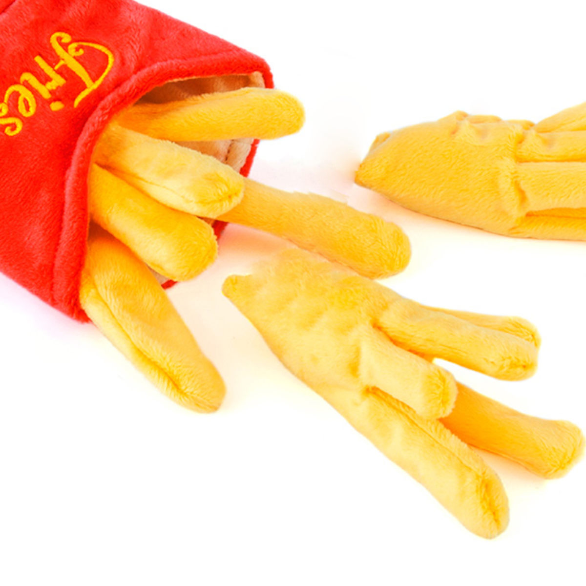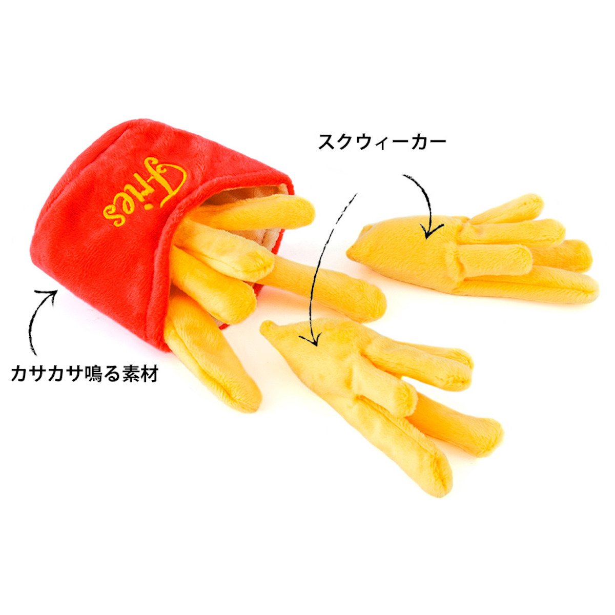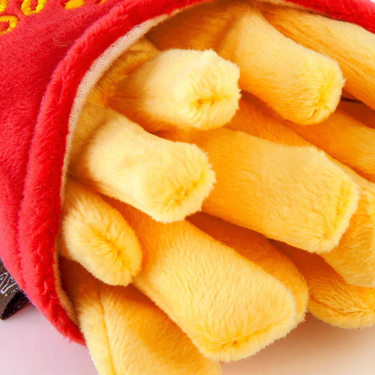 フレンチフライをモチーフにしたユニークなペット用トイです。遊び心あふれるデザインと、やわらかなぬいぐるみ素材で、愛犬が楽しく遊べるアイテムです。見た目の可愛さはもちろん、噛んだり振り回したり、しっかり遊べる仕様です。