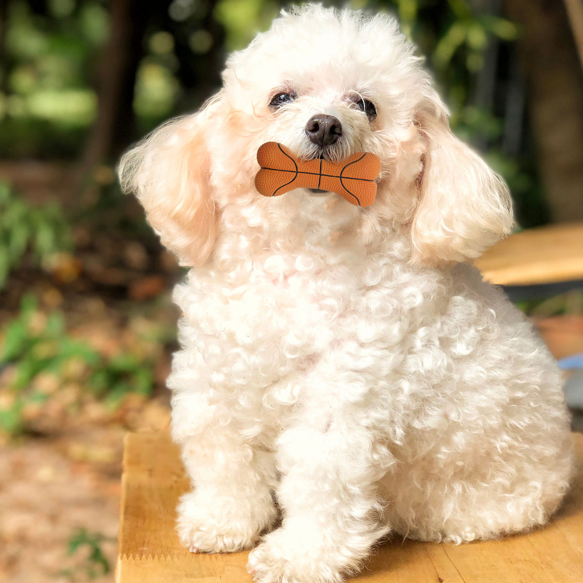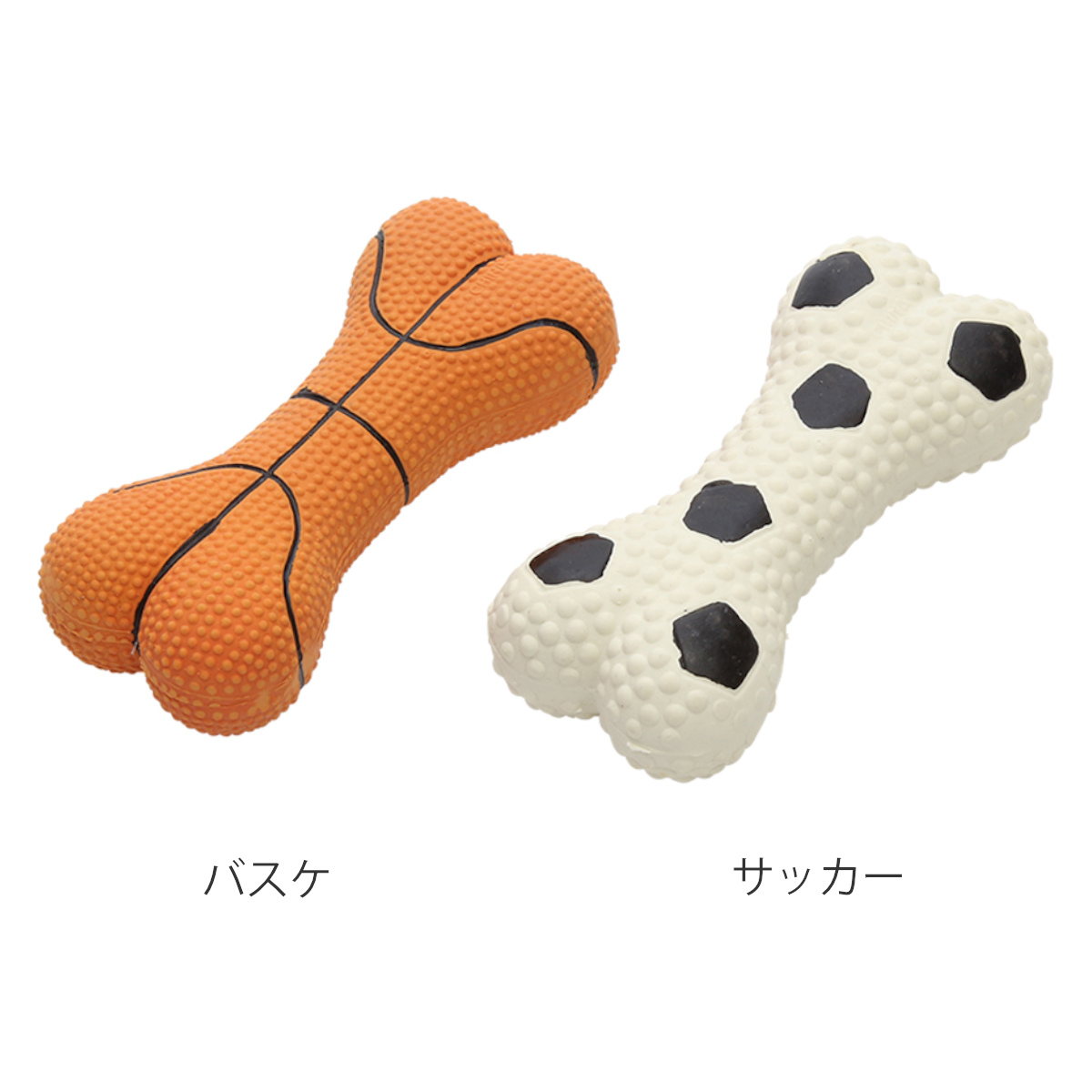 ワンちゃんがくわえやすい形状で、室内でもアクティブに遊べる、スポーティーなボーン型ドッグトイシリーズです。元気なバスケットデザインと、ポップなサッカーデザインの2種類よりお選びいただけます。