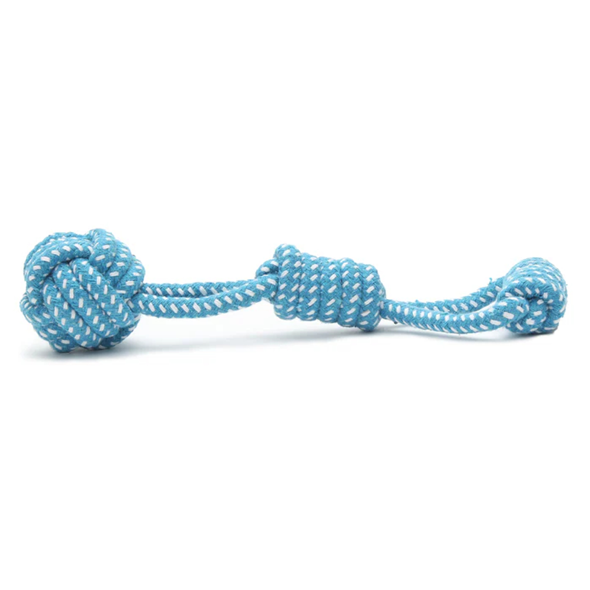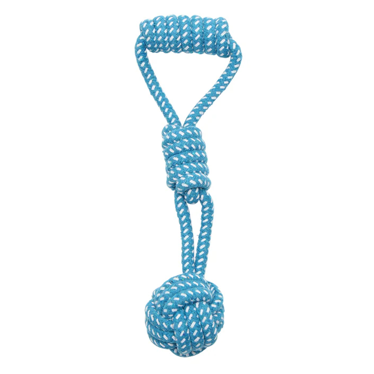 明るいブルーのロープで編まれたボールにしっかり補強された持ち手が繋がっています。丈夫に編まれているので、噛む・引っ張る・追いかける等、楽しく遊ぶことができ、しっかり噛めるので、ストレス解消やデンタルケアにもってこいです。
