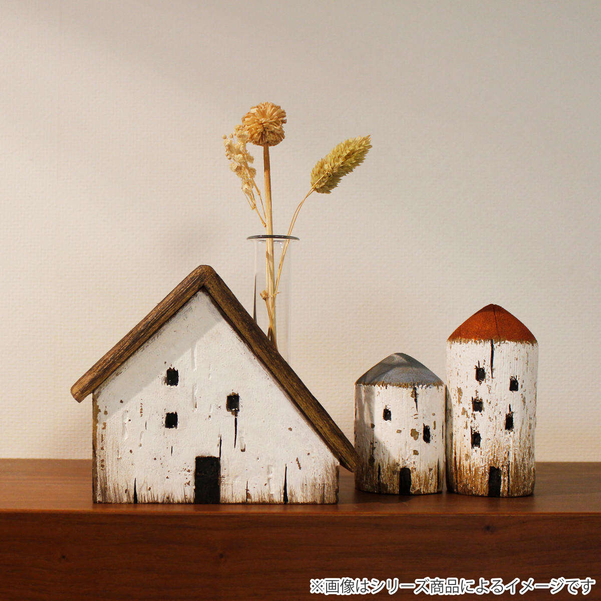 そっと飾るだけで空間のアクセントになる、素朴な風合いのオブジェたち。かすれたペイントと木のぬくもりが、あたたかい街並みを思わせます。サイズやモチーフを少しずつ揃えれば、組み合わせるたびにあなただけの街が広がります。