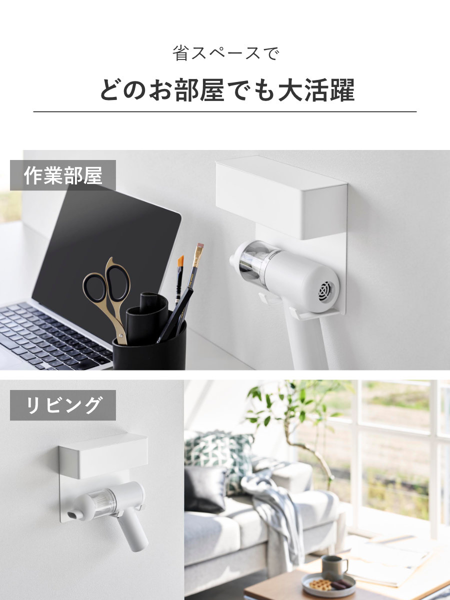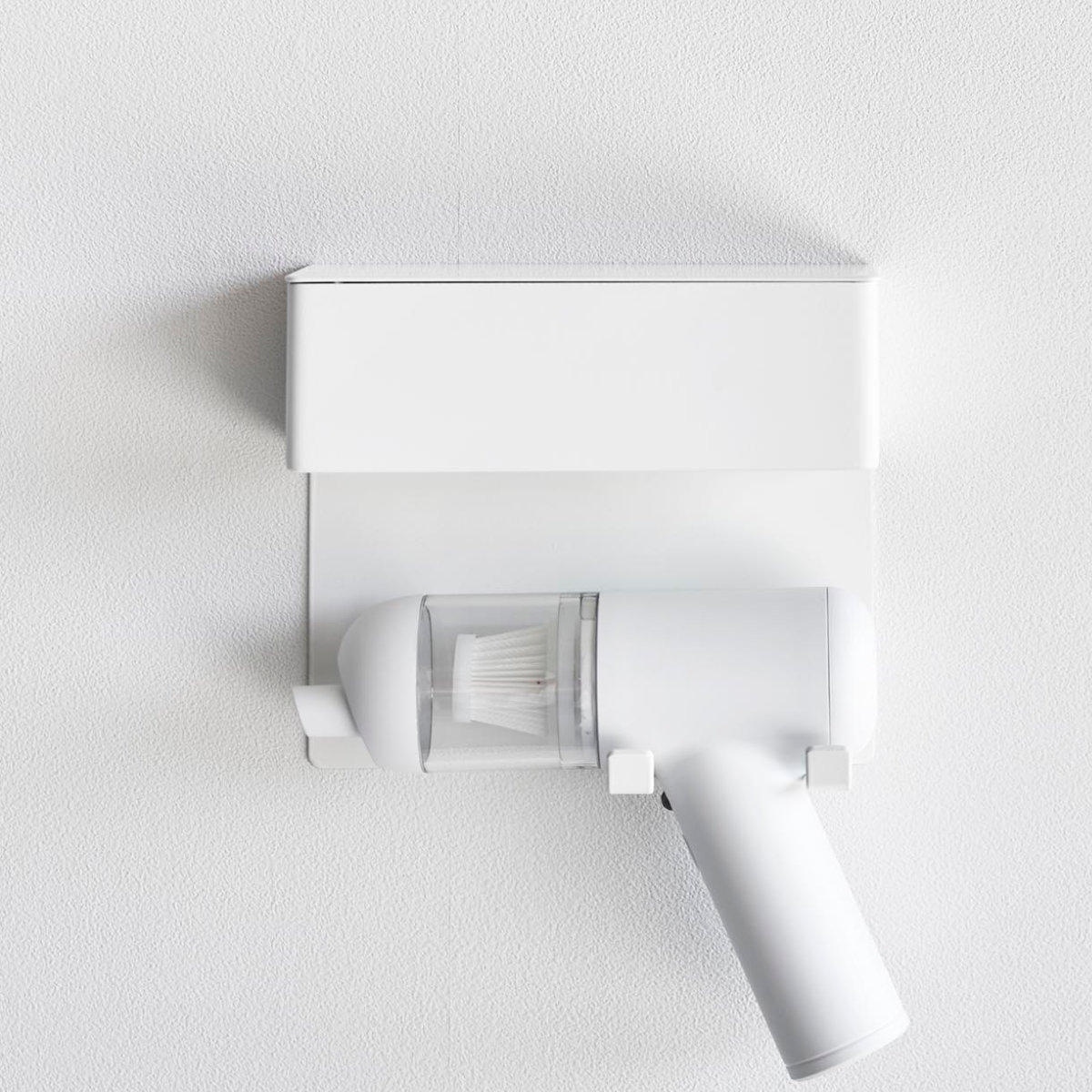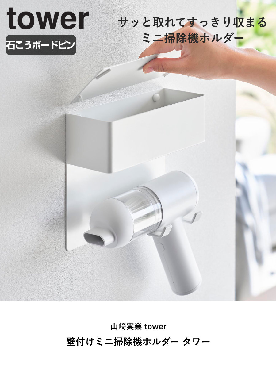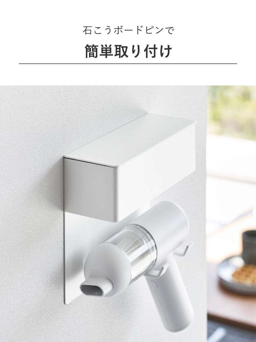 石こうボードピンで手軽に取り付け可能な、ミニ掃除機専用の壁付けホルダーです。壁の穴が目立ちにくい石こうボードピンで簡単取り付け。木ネジでも取り付け可能です。