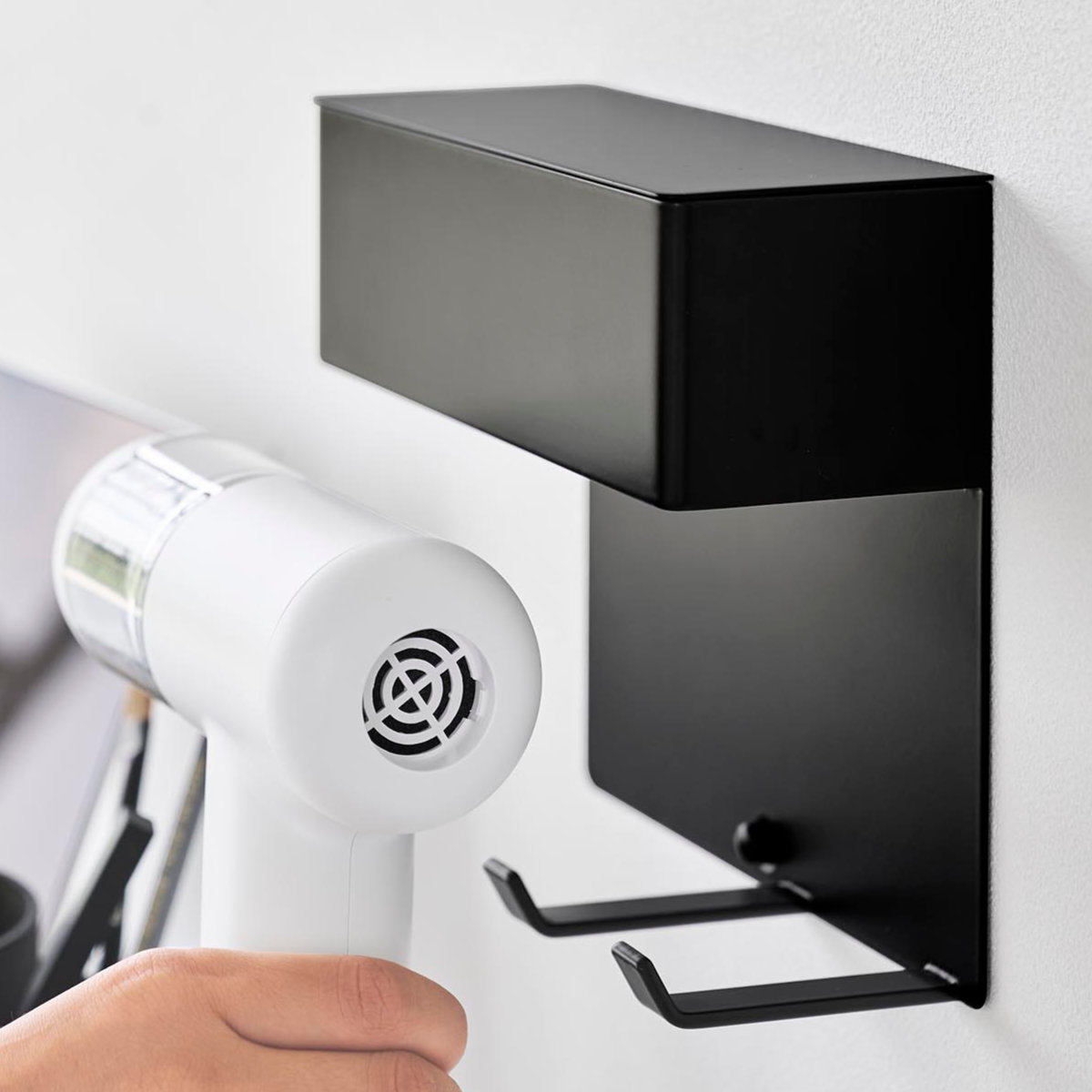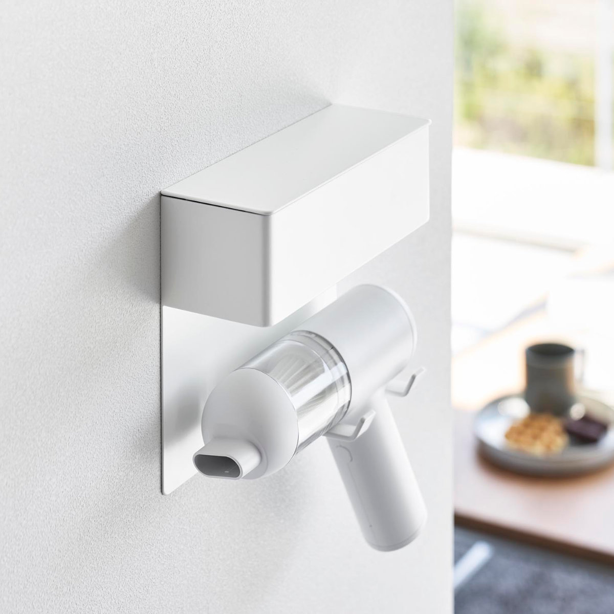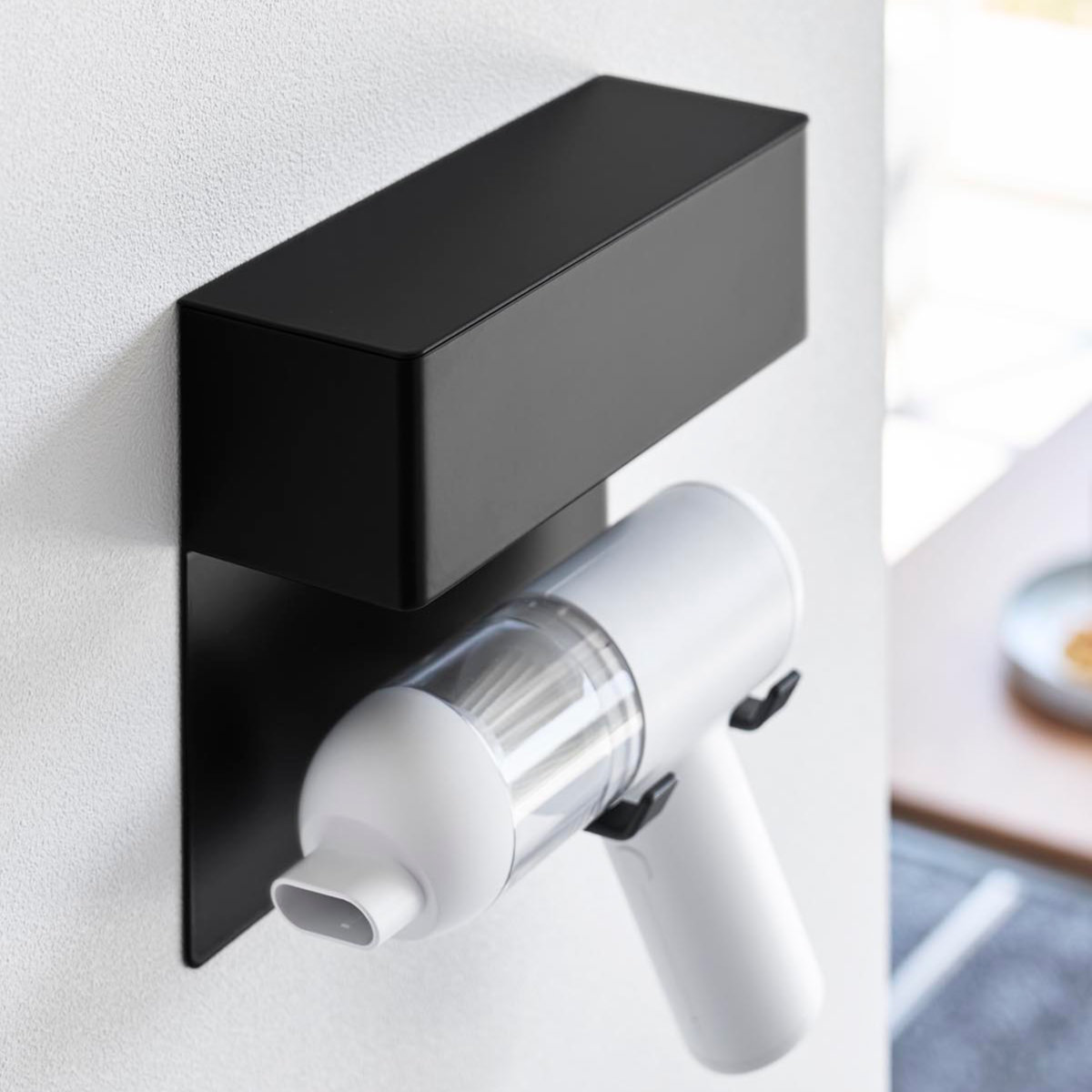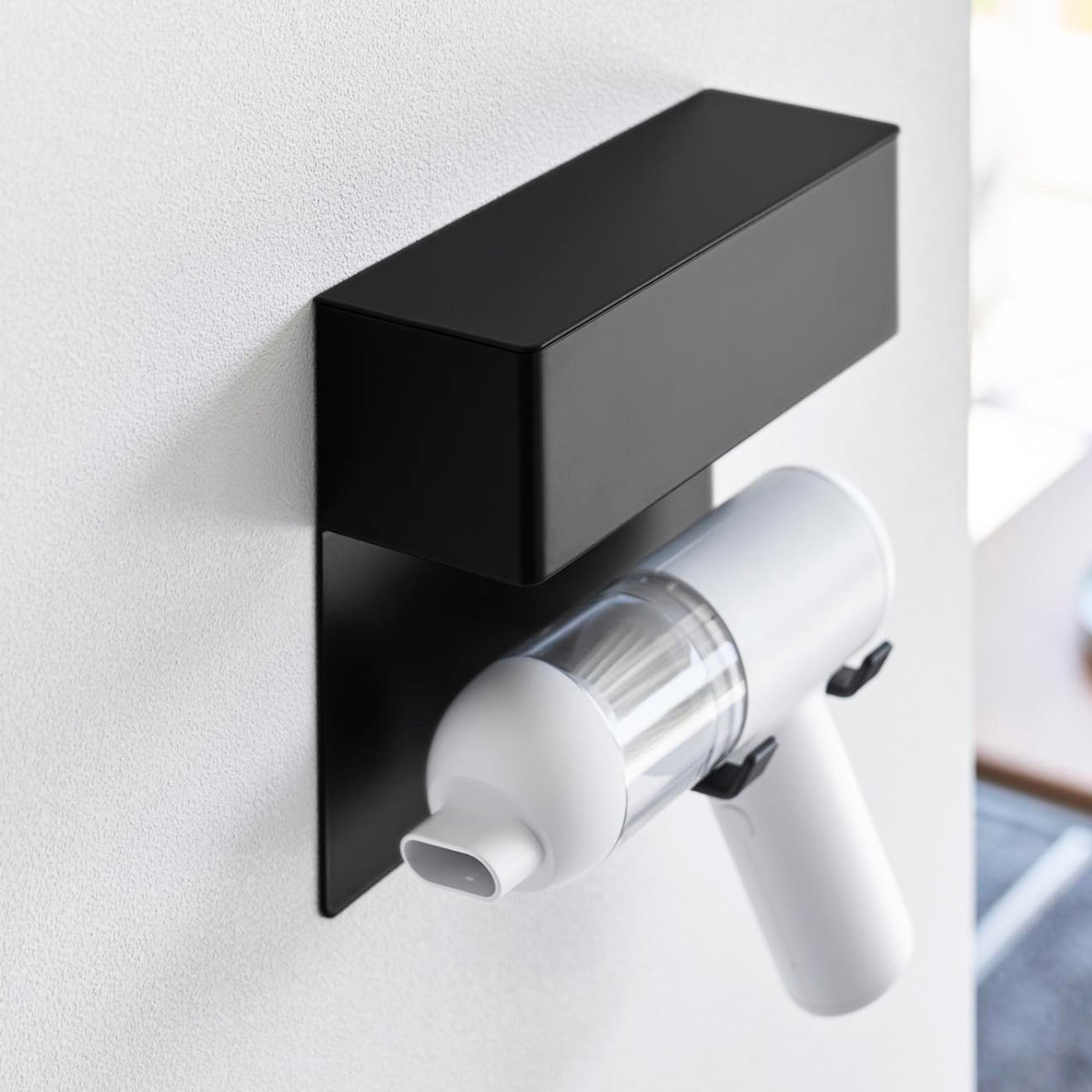 石こうボードピンで手軽に取り付け可能な、ミニ掃除機専用の壁付けホルダーです。壁の穴が目立ちにくい石こうボードピンで簡単取り付け。木ネジでも取り付け可能です。