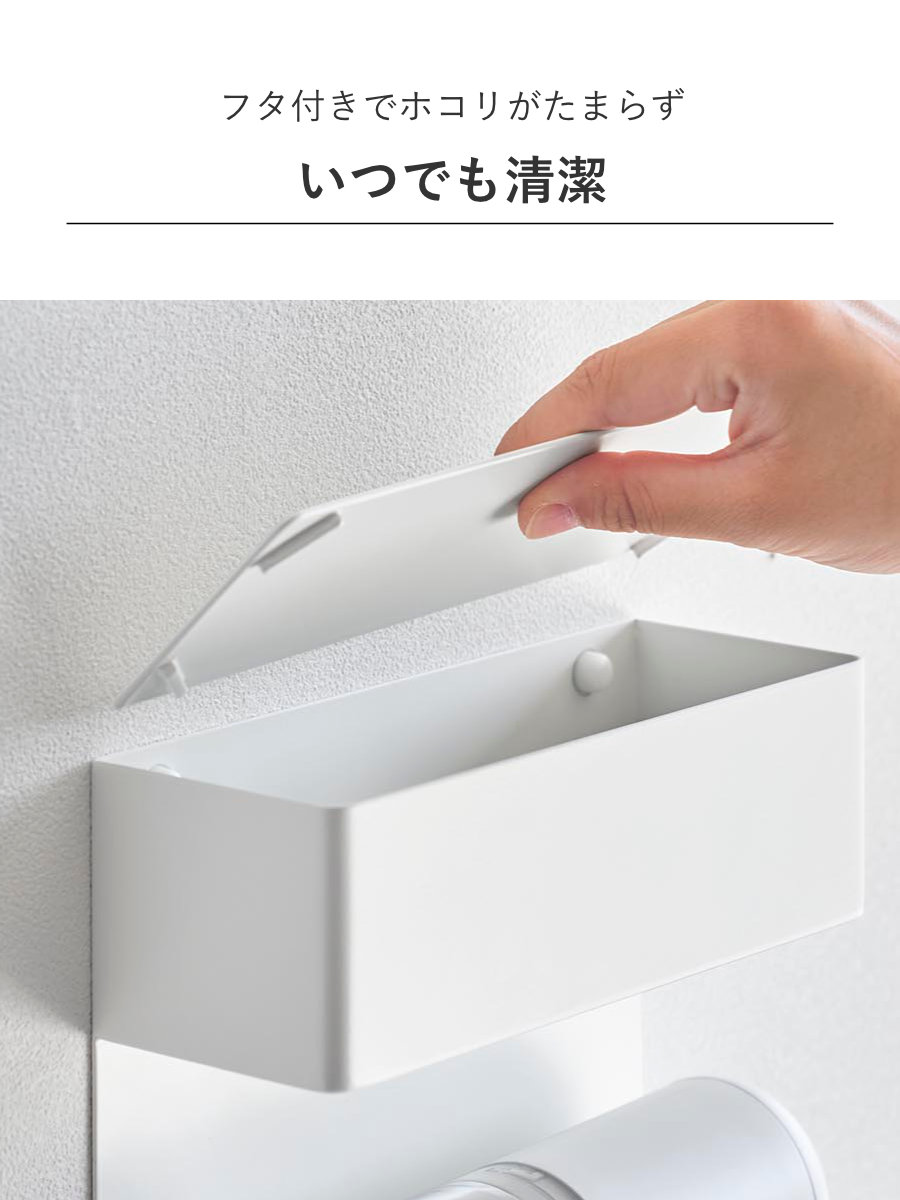 フタ付きでホコリがたまらず、収納物をいつでも清潔に保てます。見た目もすっきりで、使いたいときにサッと取り出せる便利です。