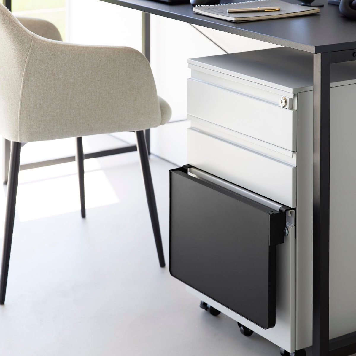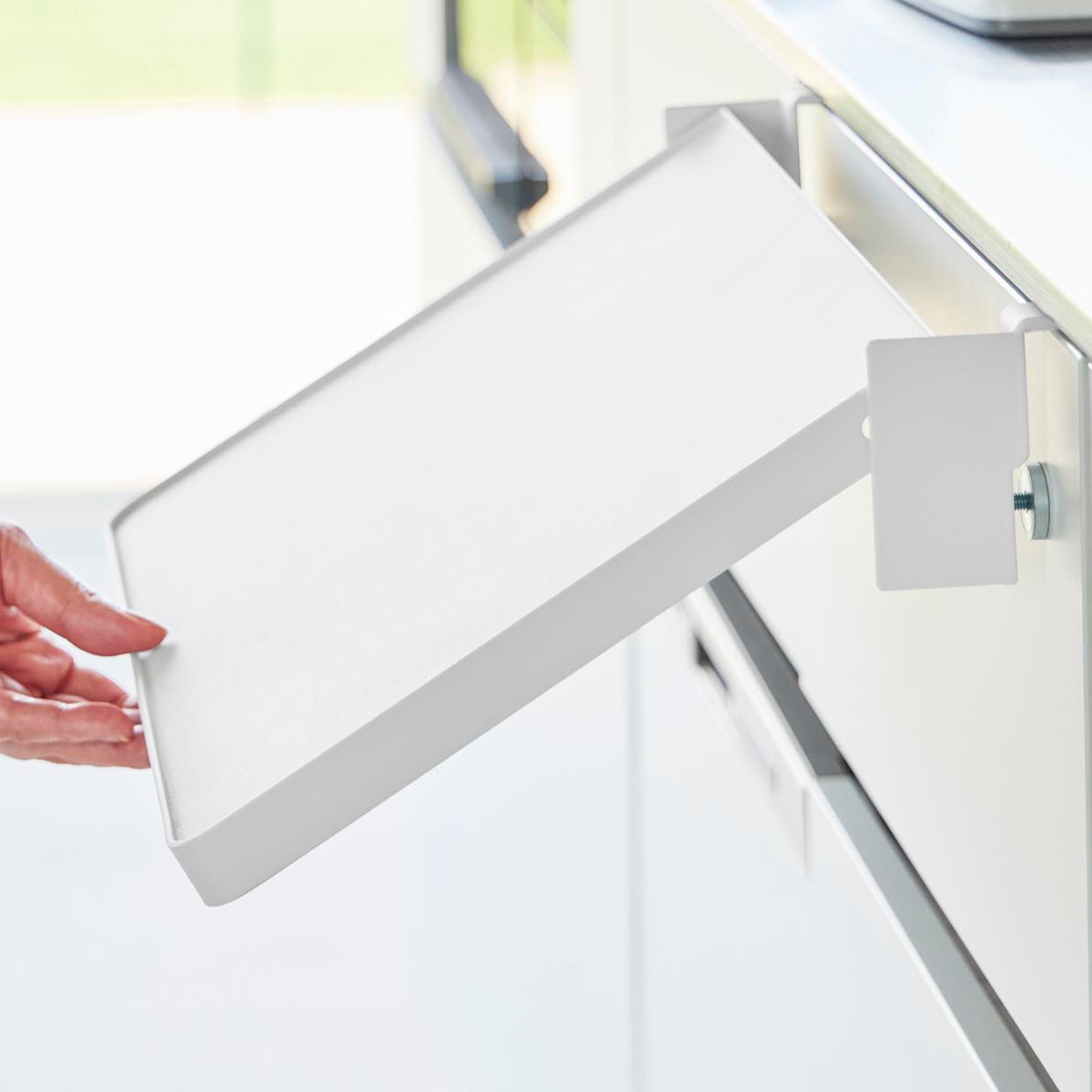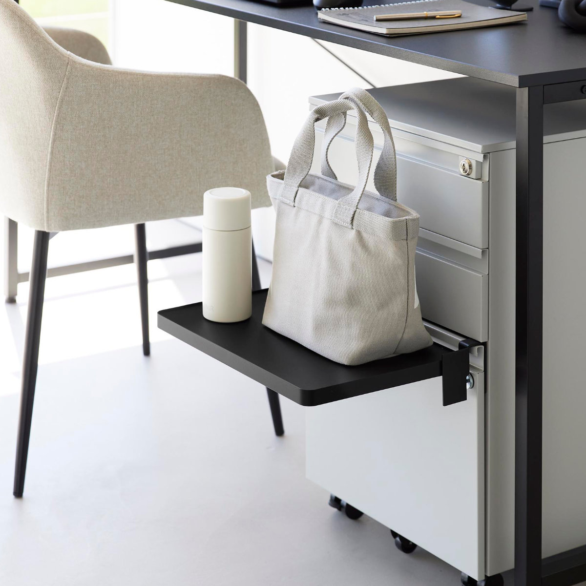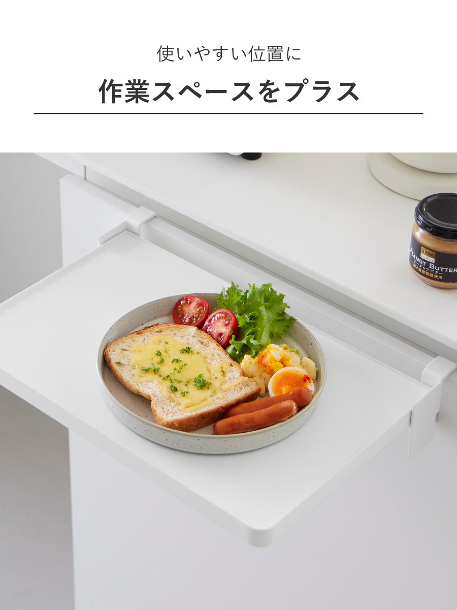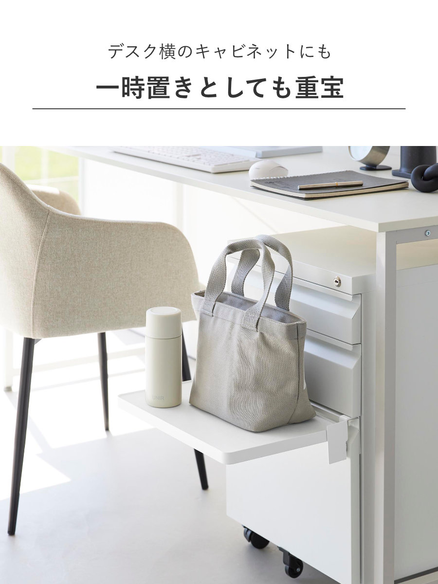 デスク横のキャビネットや収納扉に取り付ければ、作業中の資料やノートパソコン、ちょっとした軽食の置き場としても活躍。使いたいときだけサッと広げられるため、在宅ワークや勉強スペースの拡張にもおすすめです。