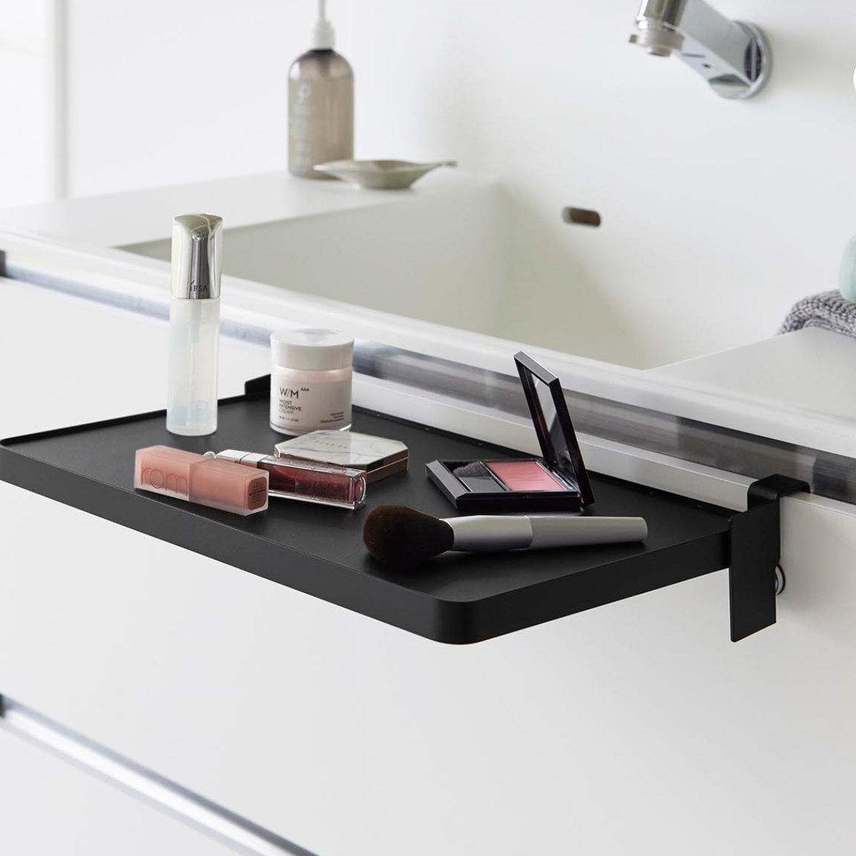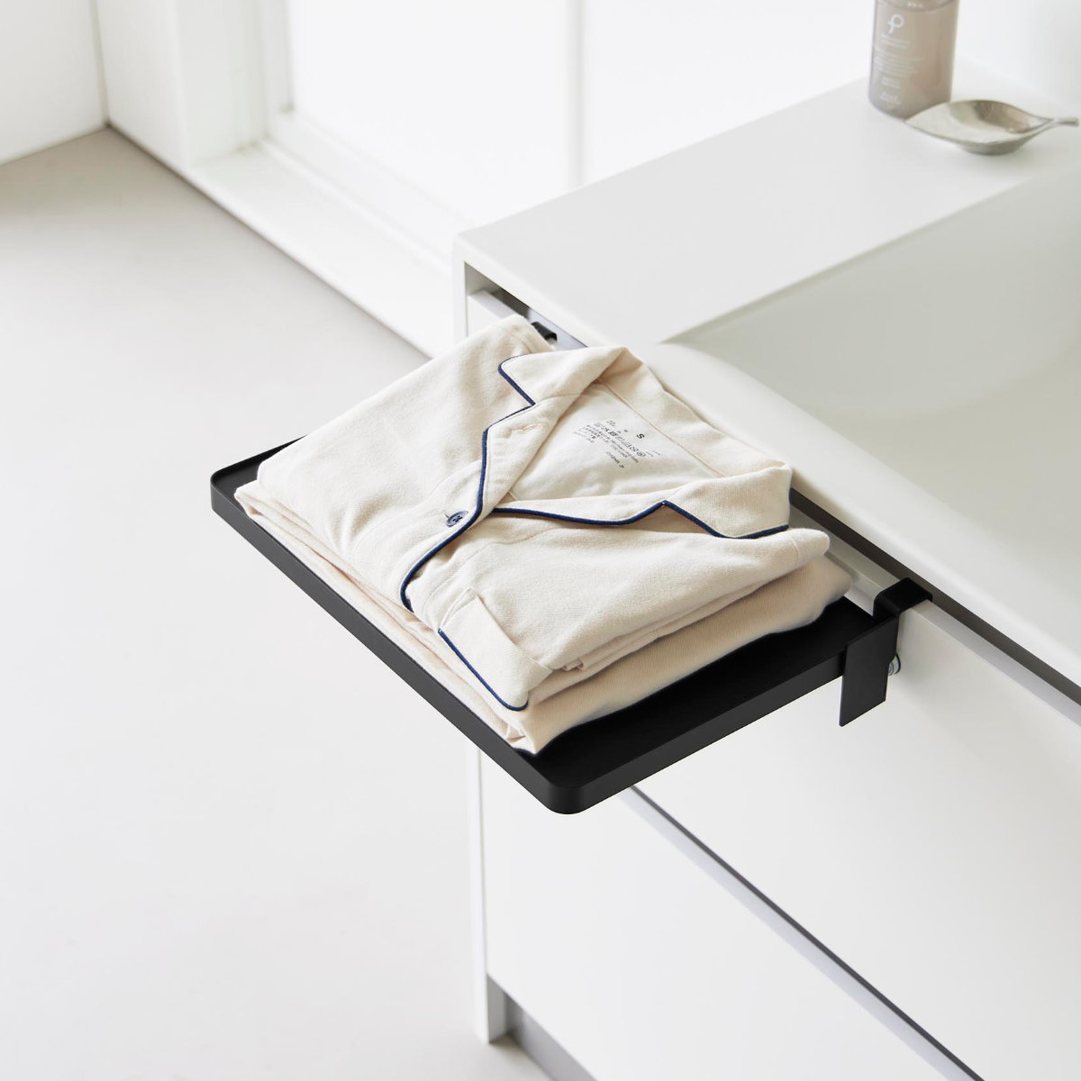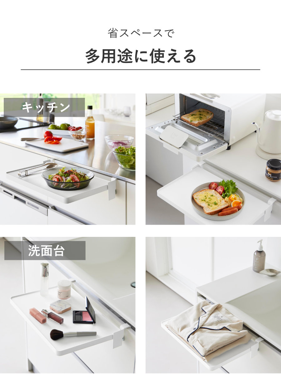 キッチンでは、料理中のボウルやお皿の仮置き、配膳準備のスペースとして活躍。調理動線をスムーズにし、作業効率を高めます。洗面台では、メイク中のコスメやヘアアイロンの一時置きに便利で、身支度を快適にサポート。入浴時にはタオルやパジャマの一時置きとしても重宝します。