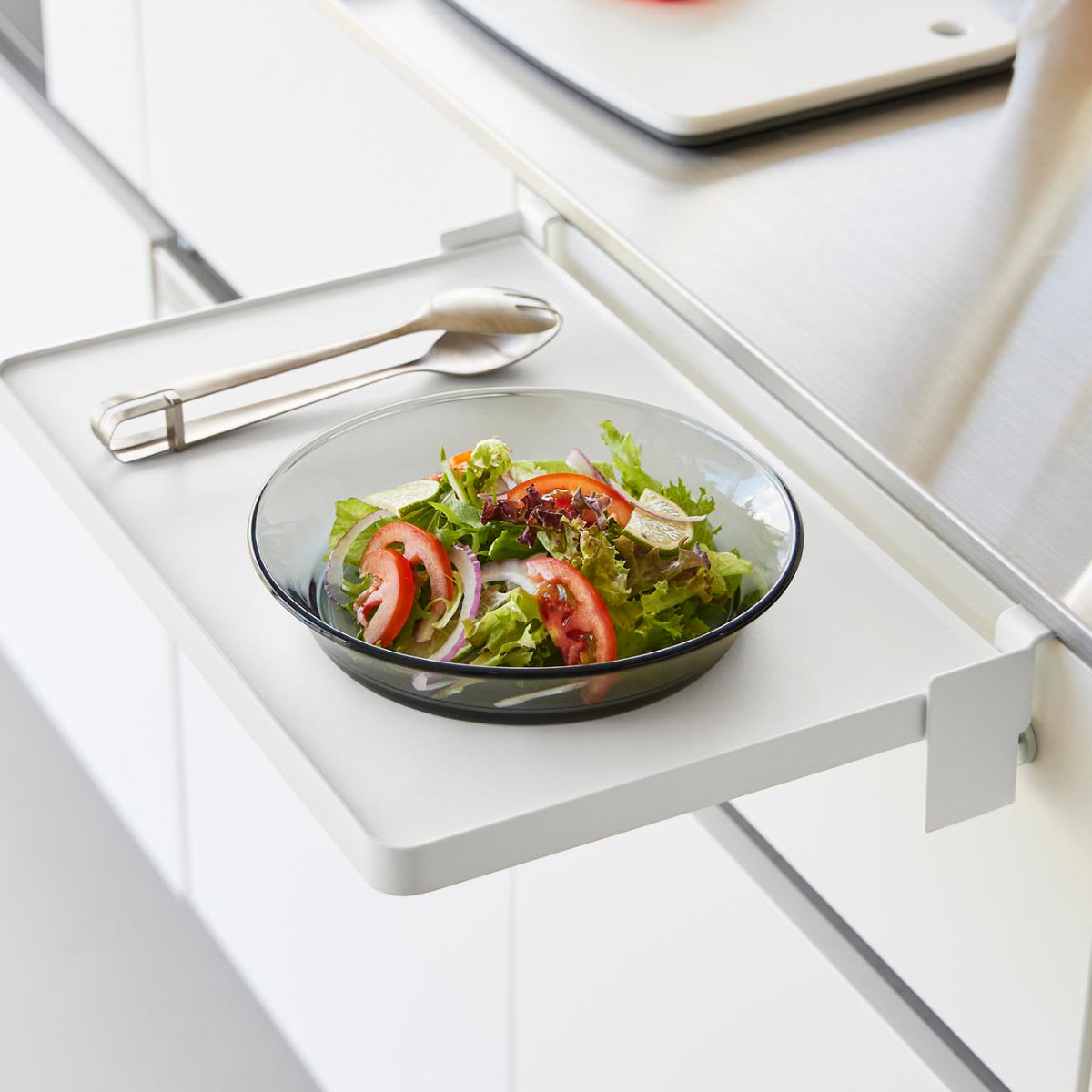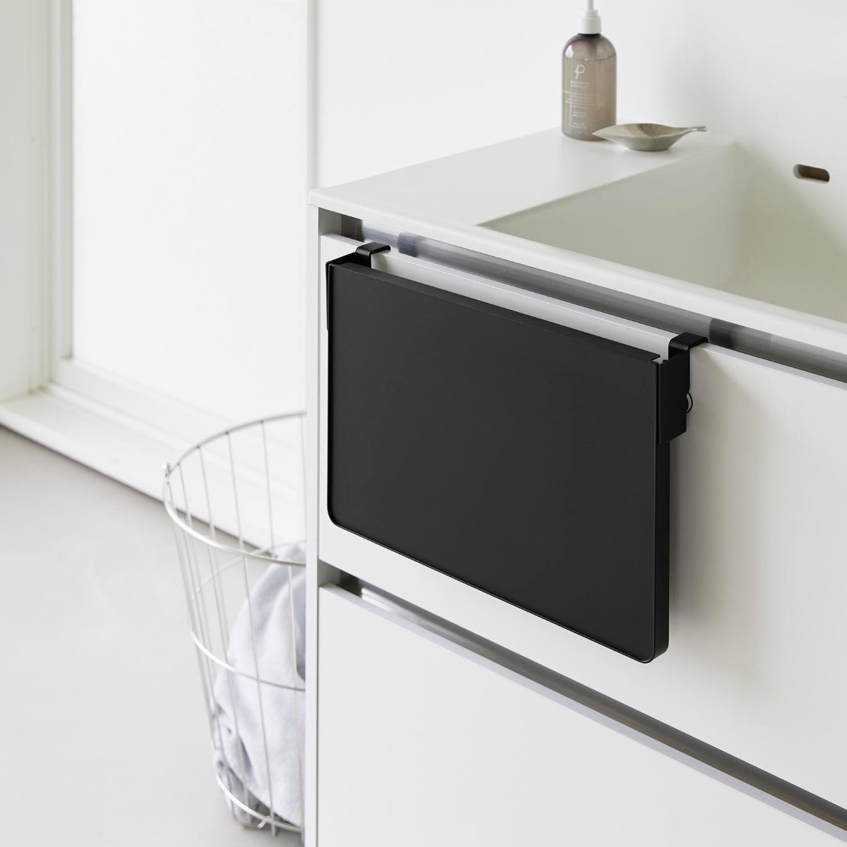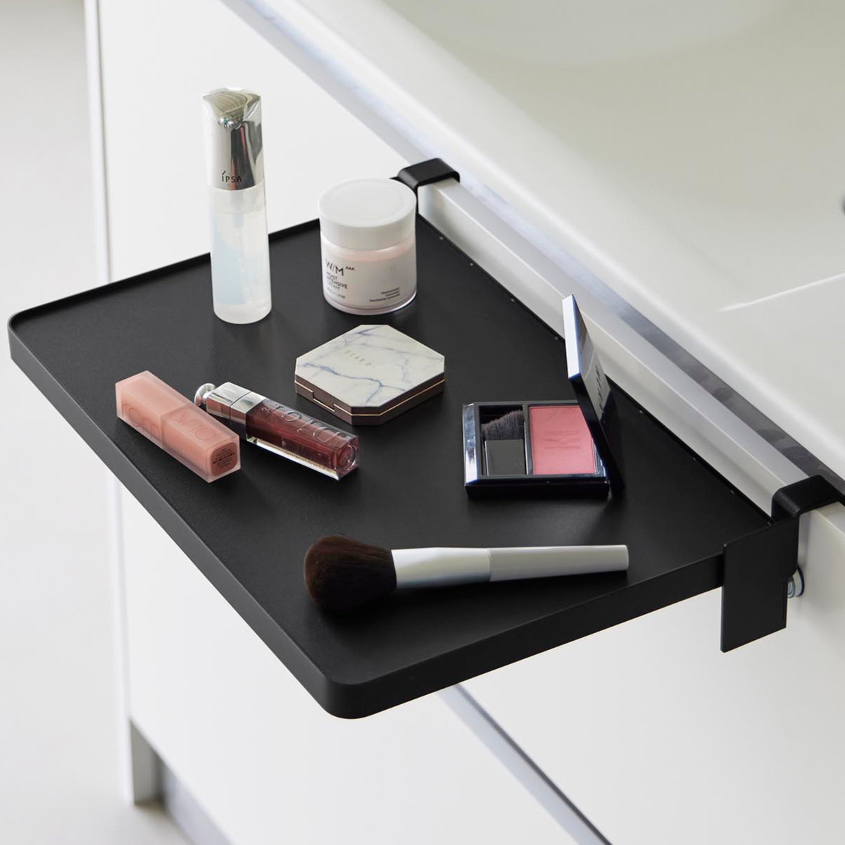 キッチンでは、料理中のボウルやお皿の仮置き、配膳準備のスペースとして活躍。調理動線をスムーズにし、作業効率を高めます。洗面台では、メイク中のコスメやヘアアイロンの一時置きに便利で、身支度を快適にサポート。入浴時にはタオルやパジャマの一時置きとしても重宝します。