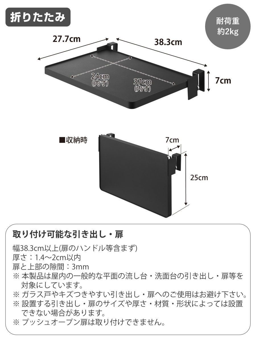 | 対応サイズ | 取り付け可能な引き出し・扉 幅38.3cm以上(扉のハンドル等含まず) 厚さ:1.4~2cm以内 扉と上部の隙間:3mm |