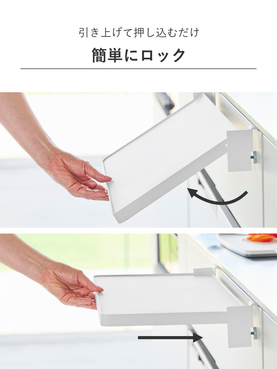 必要な時に棚を引き上げて押し込むだけで簡単にロックできるので、設置や操作もスムーズです。