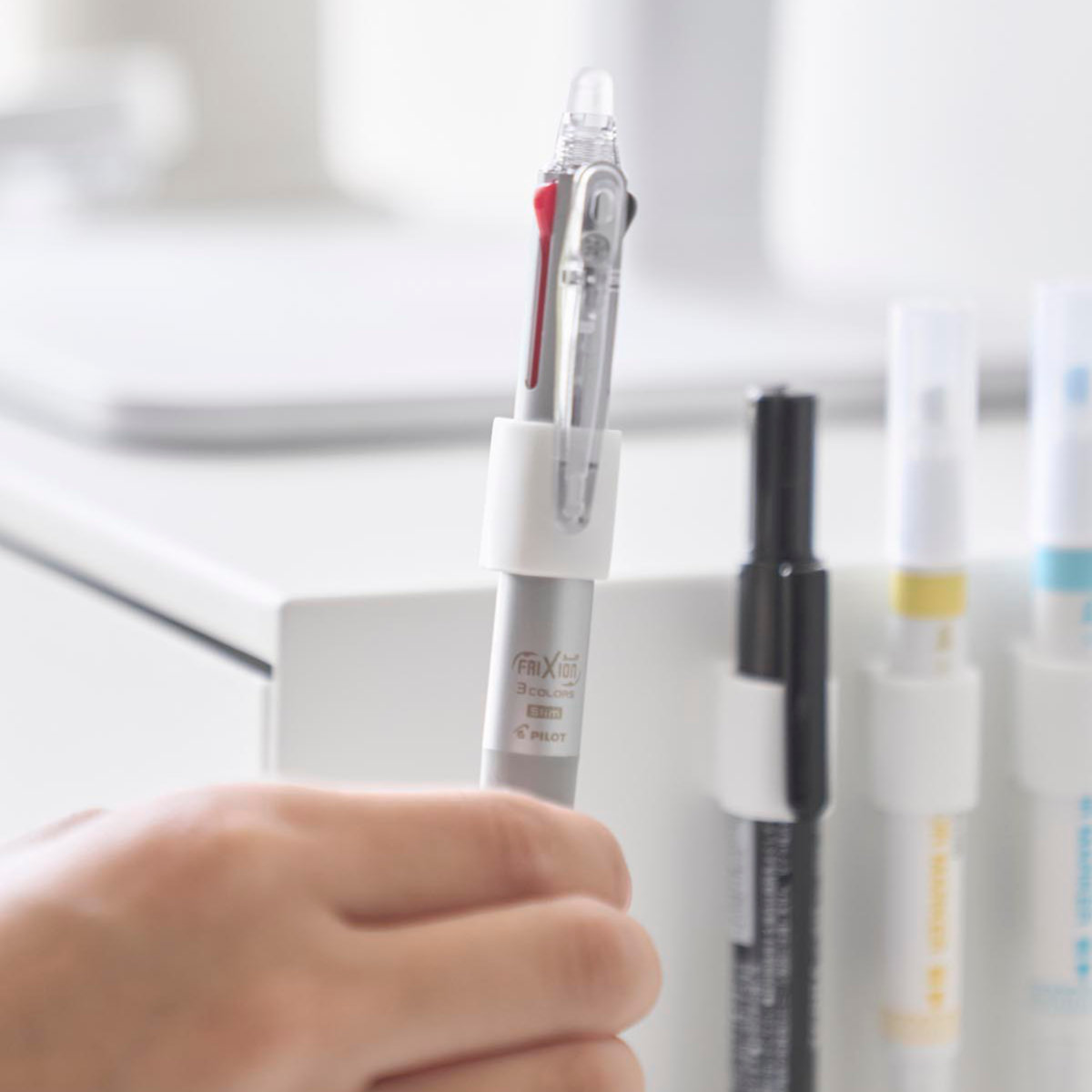 会議中や作業中でも書きたいときにサッと手に取り、そのままホルダーを装着した状態でペンをすぐ使えます。