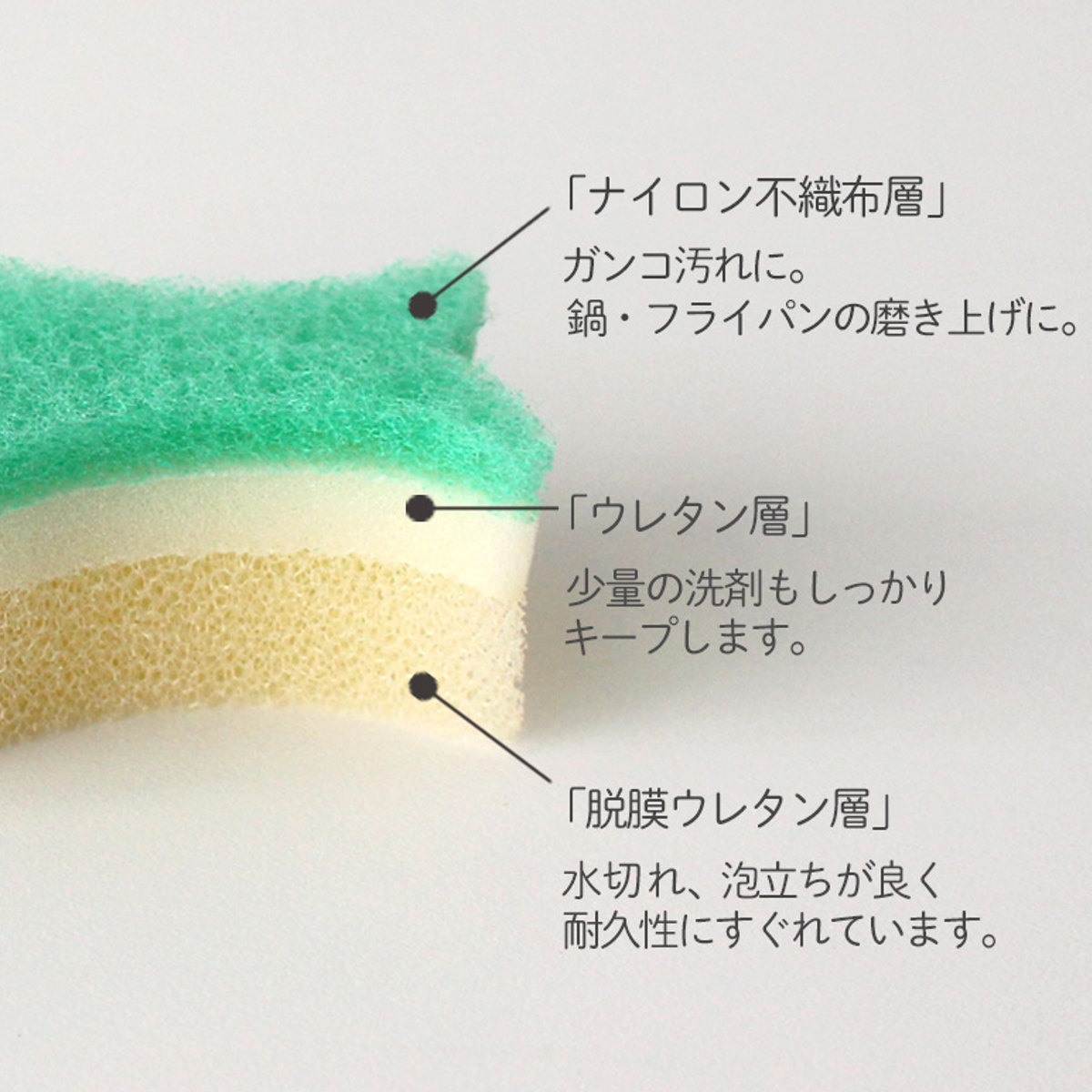 毛羽立たず食器に密着しやすい圧縮層と泡立ち水切れの良い脱膜層で、泡持ち層を挟んだ3層構造です。上部のナイロン不織布層はガンコ汚れ・フライパンの磨き上げに便利です。中央のウレタン層は、少量の洗剤もしっかりキープしてくれます。また、下部は水切れ、泡立ちが良く耐久性に優れた脱膜ウレタン層になっています。 通気性が良くすぐに乾くから、菌が繁殖しにくいです。